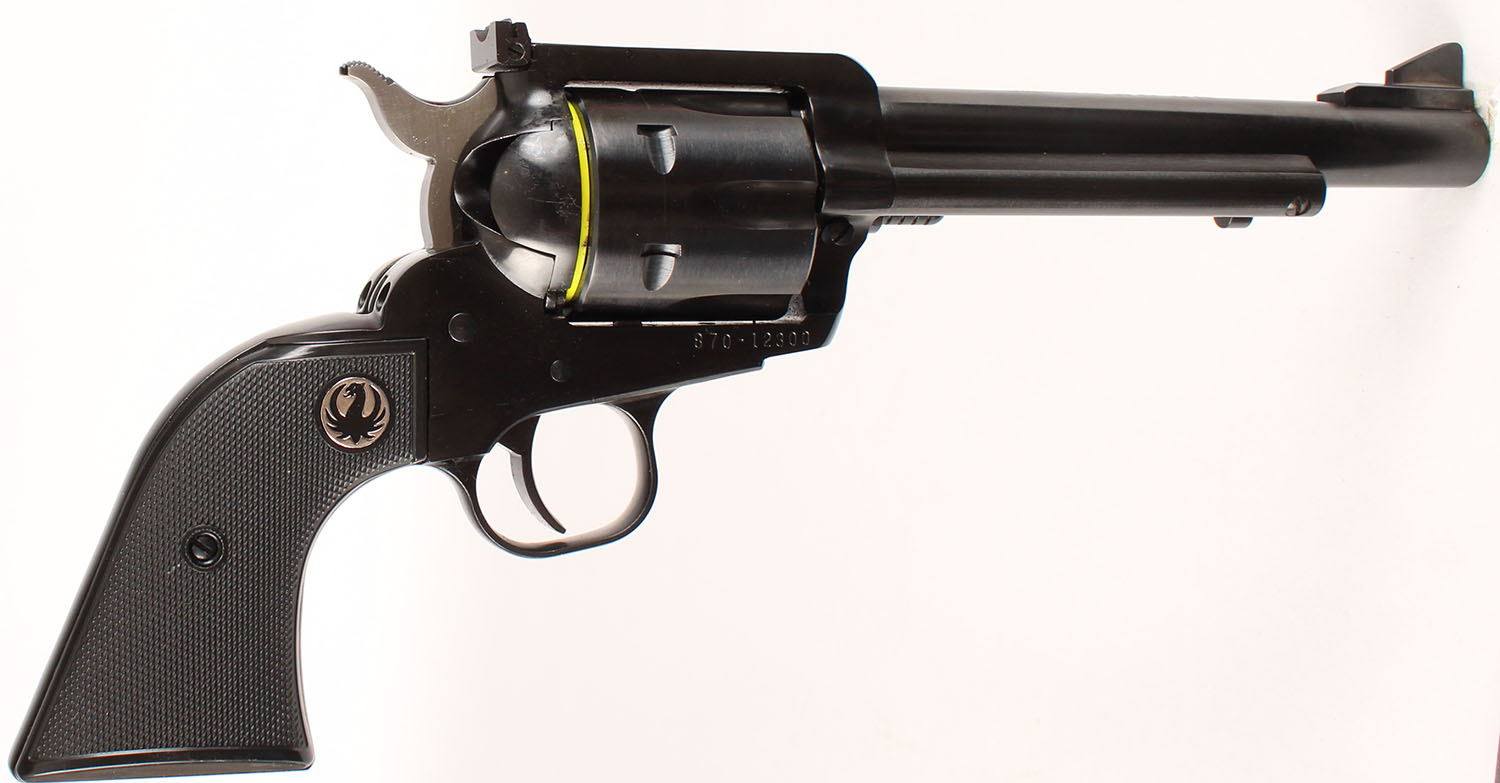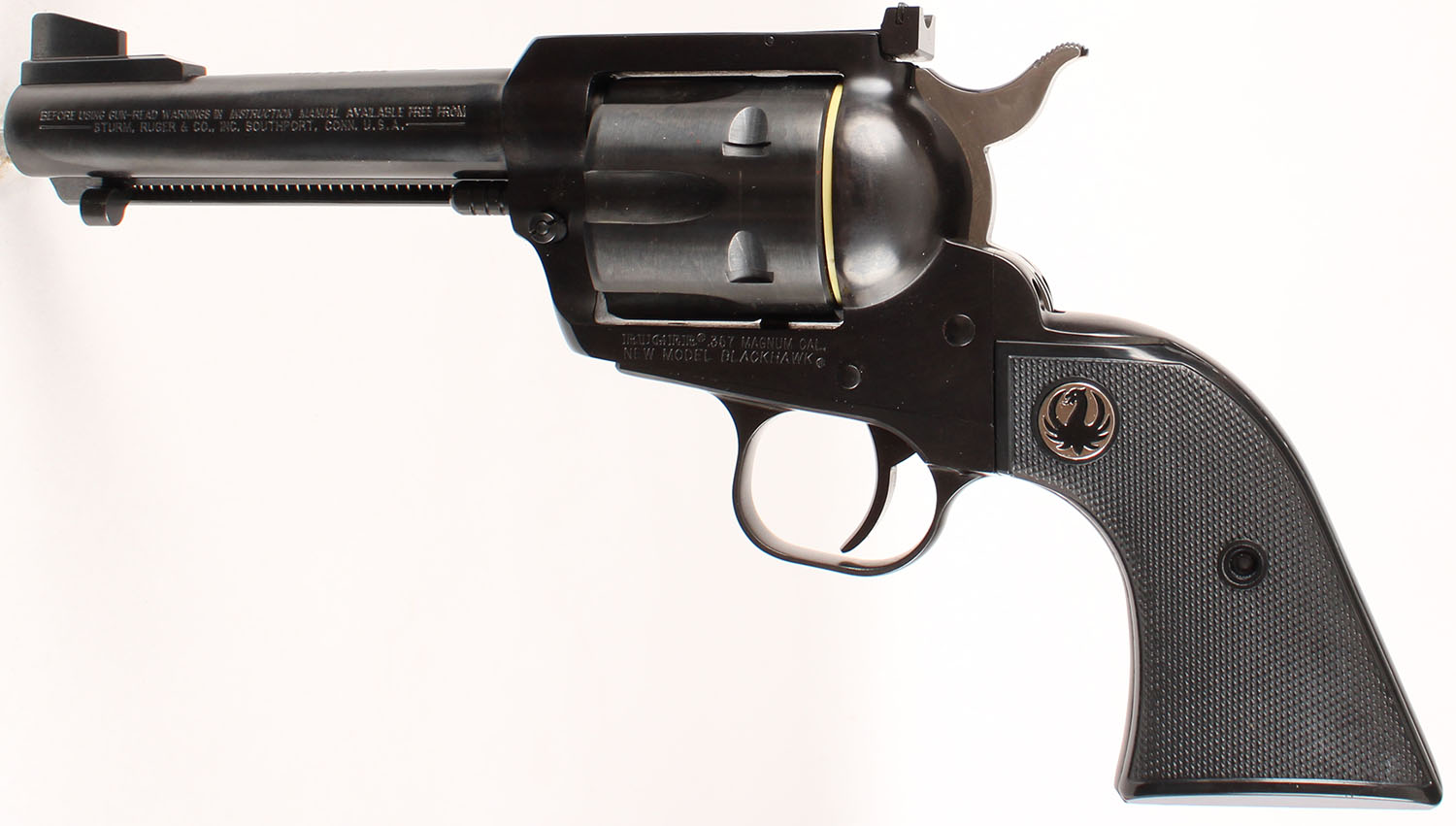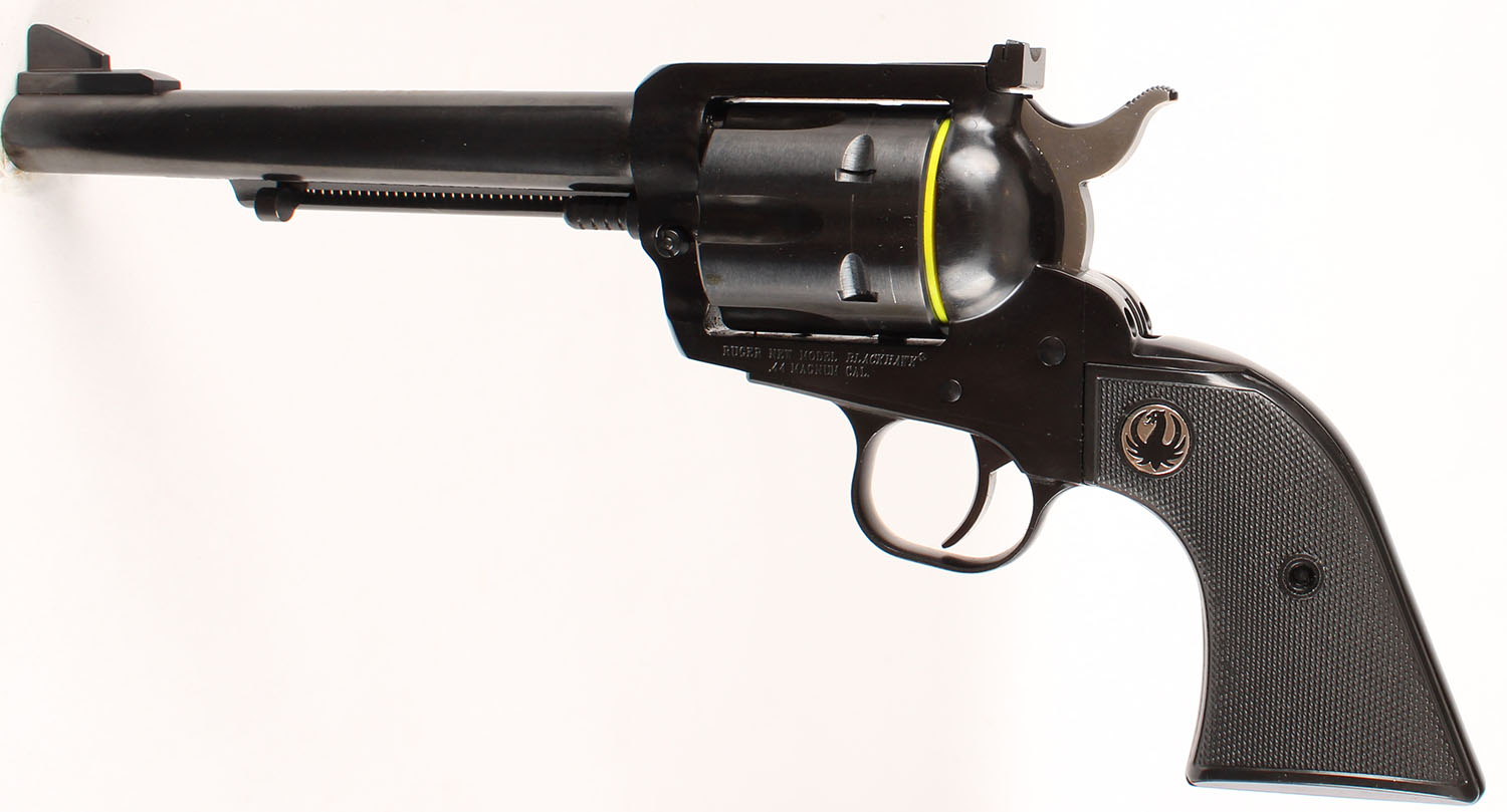 BOXED & CASED, Ruger 50th Anniversary Edition, Matched Pair, (1) Ruger, New Model Blackhawk, CAL: .357 MAG, MFG: 2006, SN: 520-12300, Single Action Revolver, 4 3/4'' barrel. The Ruger logo medallion checkered plastic grips are excellent. The factory metal blue finish rates 99%+ overall. Bore is mint, appears unfired outside factory test. Cylinder has plastic safety disc. The frame holds a Micro adjustable rear sight & the barrel has a block elevated serrated blade front sight. Comes in special edition red hard case, with related paperwork, test fire cartridge, lock/key & original packaging. (2) Ruger, New Model Blackhawk, CAL: .44 MAG, MFG: 2006, SN: 870-12300, Single Action Revolver, 6 1/2'' barrel. The Ruger logo medallion checkered plastic grips are excellent. The factory metal blue finish rates 99%+ overall. Bore is mint, appears unfired outside factory test. Cylinder has plastic safety disc. The frame holds a Micro adjustable rear sight & the barrel has a block elevated serrated blade front sight. Comes in special edition red hard case, with related paperwork, test fire cartridge, lock/key & original packaging. Included with this special edition set is a wood presentation case with green interior. It has cut-outs for both revolvers, a glass lid that's marked ''RUGER 50TH ANNIVERSARY MATCHED SET .357 & .44 MAGNUM'' and also holds a Ruger Firearms patch, pin & case key. A great commemorative set, perfect for a Ruger collection. FFL Req. - Value: 1500 to 2500