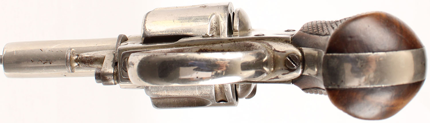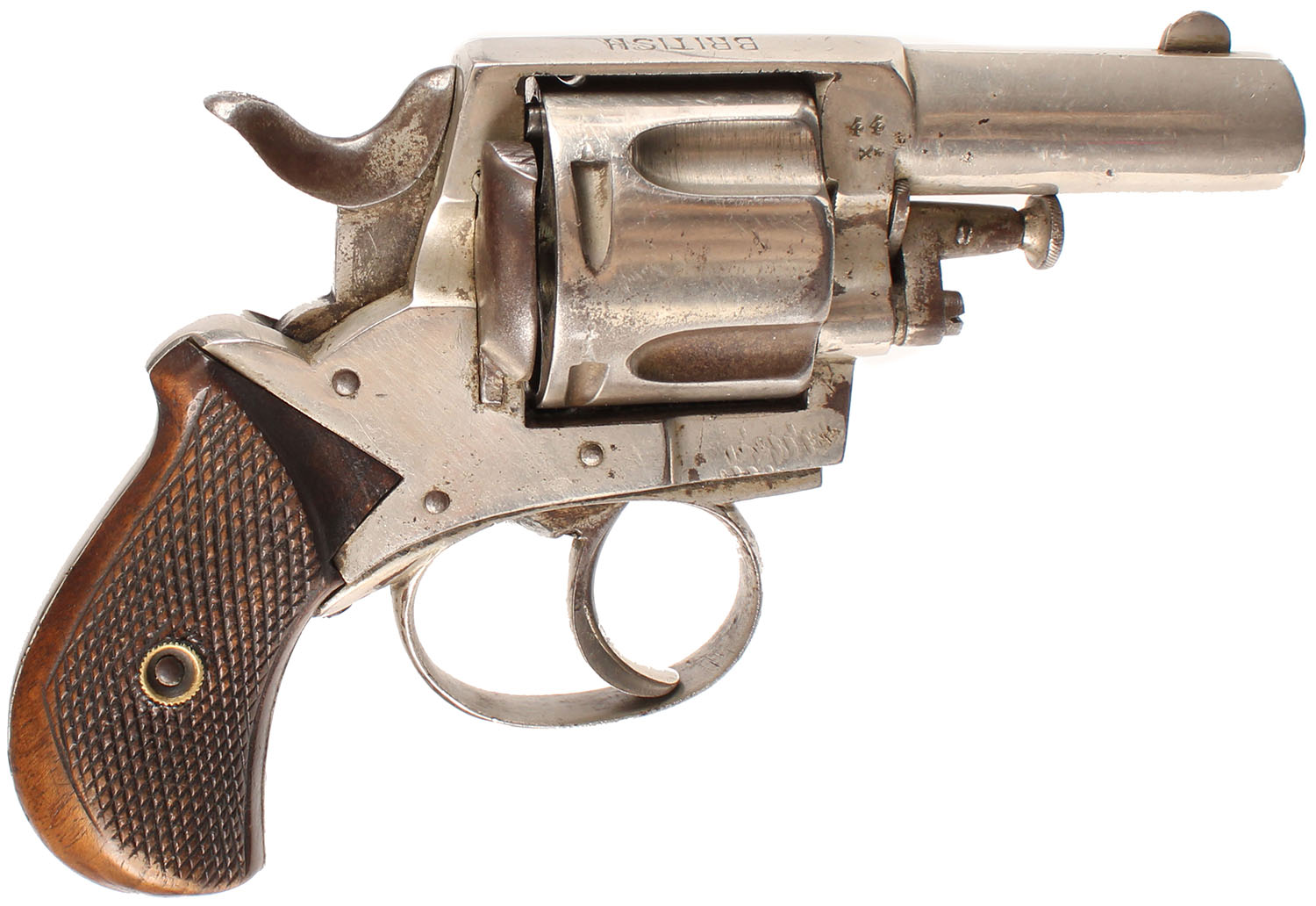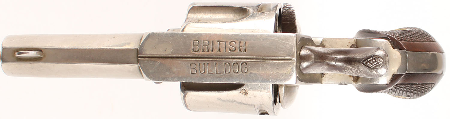 Belgian ''British Bulldog'', CAL: marked 44, MFG: 1870's-early 1890's, SN: N/A, Double Action Revolver, 2 1/2'' barrel. The top of the frame is marked ''BRITISH BULLDOG'', the right side is marked ''44'' over ''Star/X'' proof mark & the face of the cylinder is marked with '''44'', ''Star/X'' & Leige 1811-1892 proof mark. The checkered bird head wood grips are excellent. There are minor handling marks, with slightly worn checkering. The nickel finish rates 80% overall, with areas worn to metal grey & toned to a brown patina. Bore is good, with consistent roughness. The barrel holds a small half-moon blade front sight. Antique, No FFL Req. - Value: 300 to 600