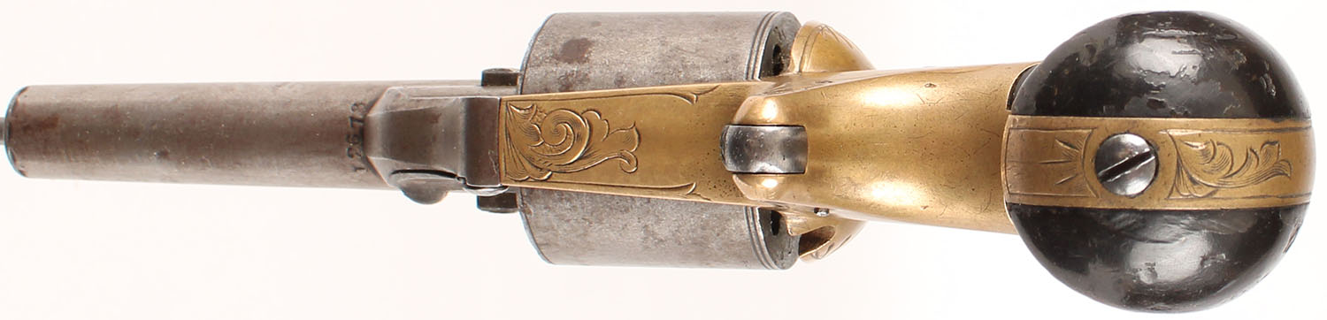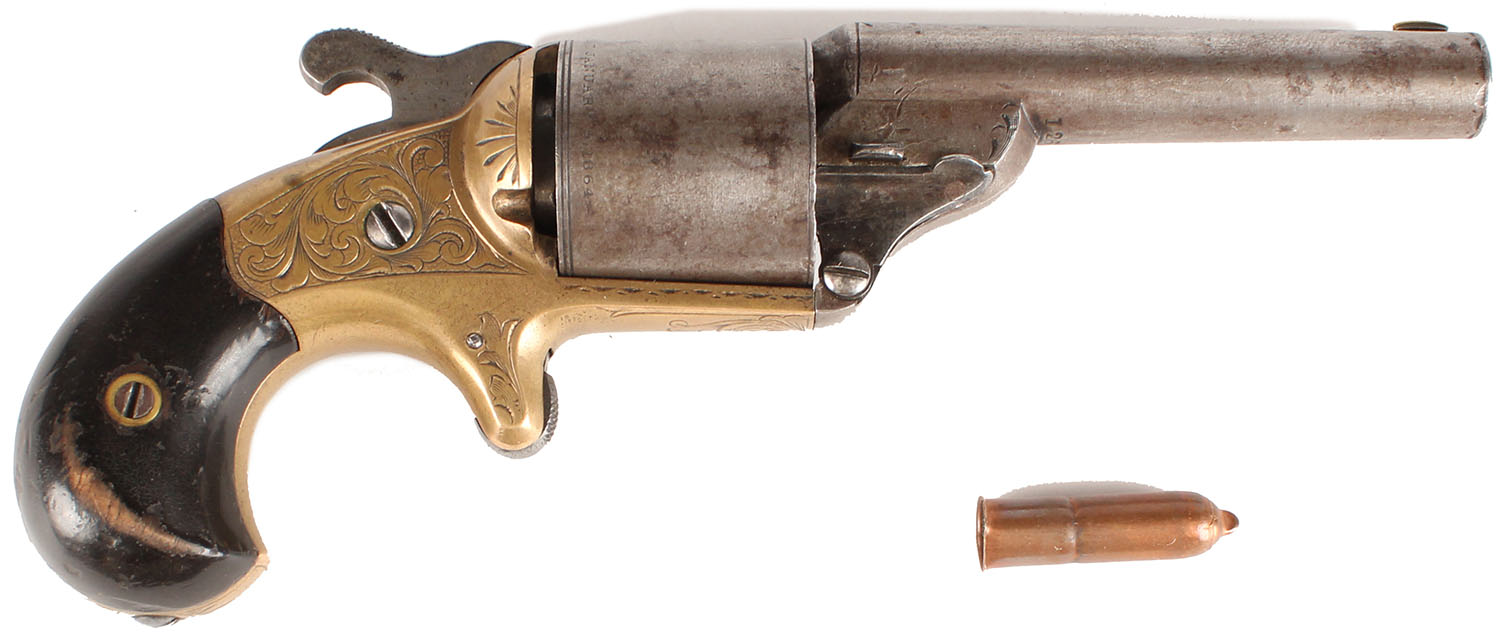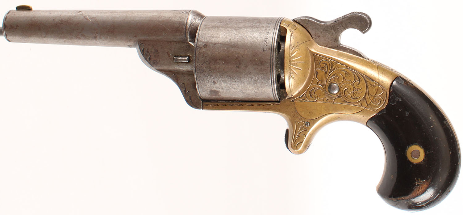 Moore's Pat Fire Arms Co, Teat-Fire Pistol, CAL: 32 Teat-Fire, MFG: 1864-70, SN: 12678, Single Action Front-Loading Revolver, 3 1/4'' barrel. The bird's head wood grips are excellent. There are contusions, scrapes & spots of flaking finish. The frame & barrel housing display simple floral engravings. The rear edge of the cylinder is marked ''D. WILLIAMSONS PATENT / JANUARY 5, 1864''. The barrel, cylinder & hammer are all fully worn to metal grey, with a thin brown patina. The brass frame is very good, with overall light wear & an aged patina. Bore is good, with consistent pitting. The barrel holds a worn brass blade front sight. Hook extractor is not present. Of the 30,000 of these revolvers produced, 20,000 were made without the hook extractor. Comes with a single 32 Teat-Fire cartridge. Antique, No FFL Req. - Value: 500 to 1000