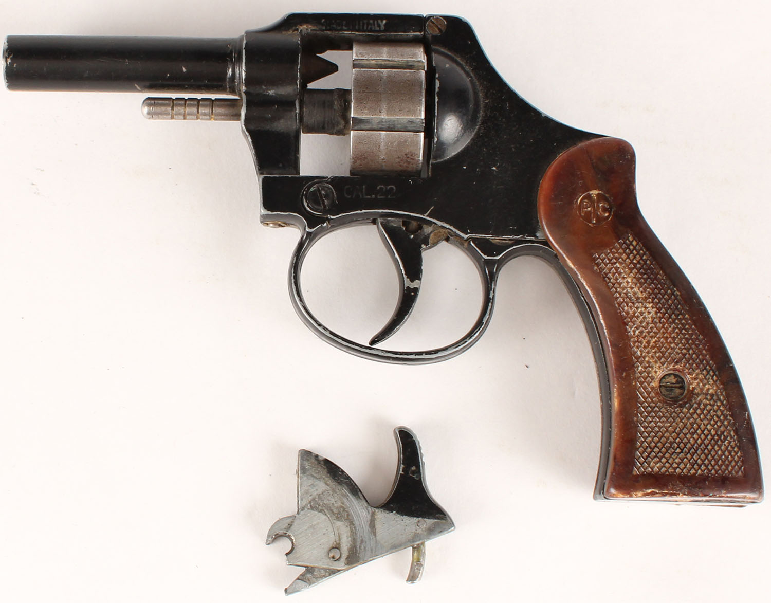 Italian Produced Starter Pistol, CAL: 22 BLANK, MFG: N/A, Double Action Revolver, No Barrel. The S/L marked checkered plastic grips are good, they have numerous contusions & dings. The matte black finish rates 80% overall. No sights. The trigger functions & cylinder rotates, but the hammer assembly is disconnected & doesn't function. NON FUNCTIONING, This is being sold as a parts gun, sold as-is, NO RETURNS ON THIS LOT. Starter Pistol, No FFL Req. - Value: 40 to 100
