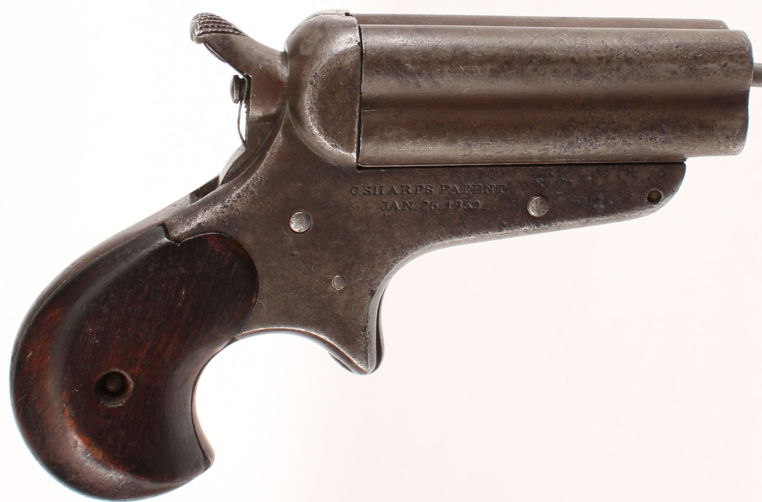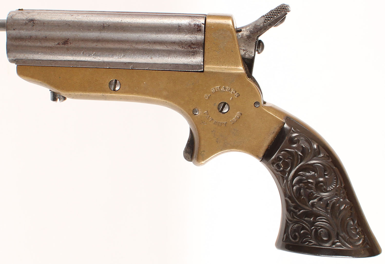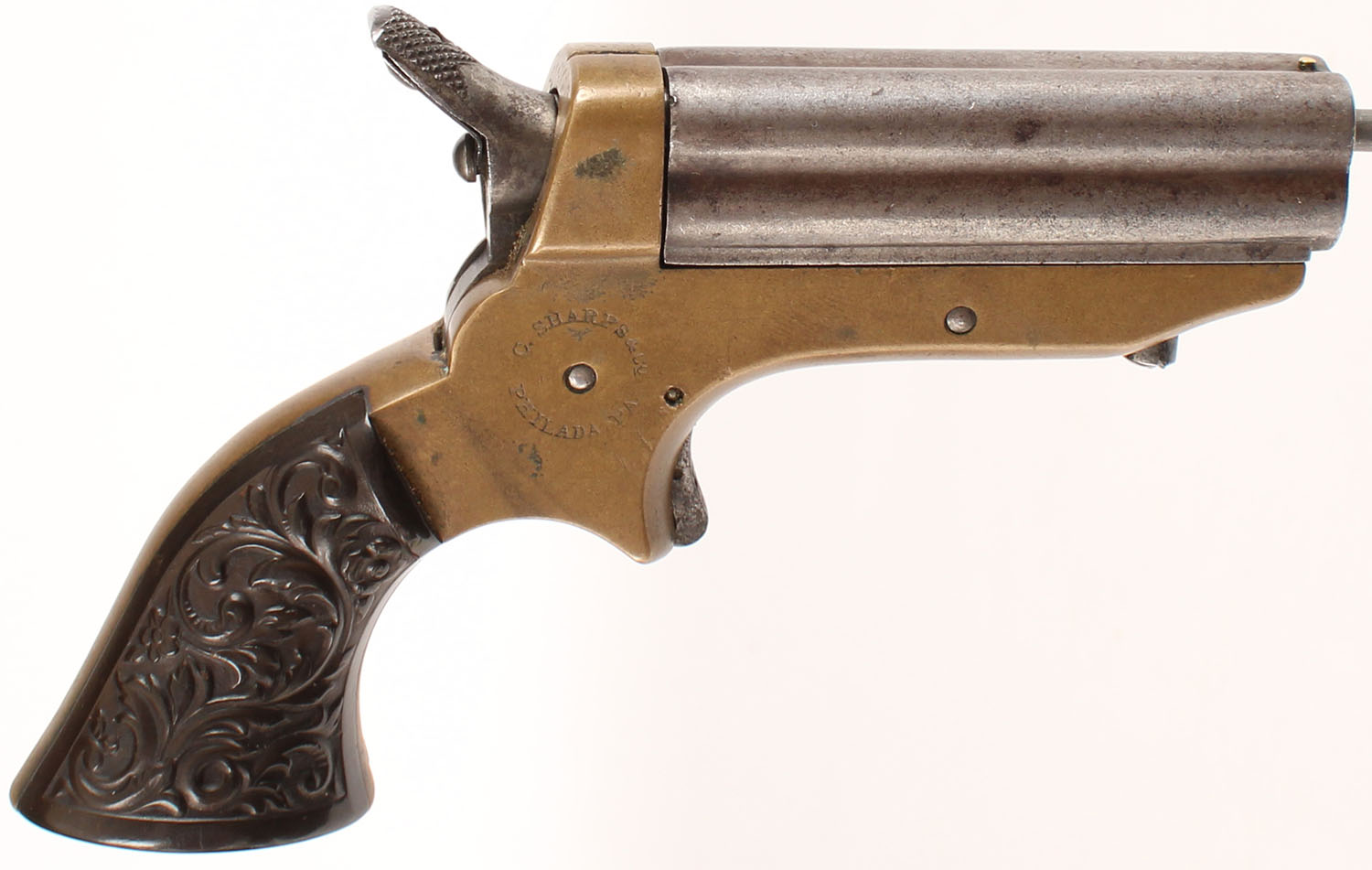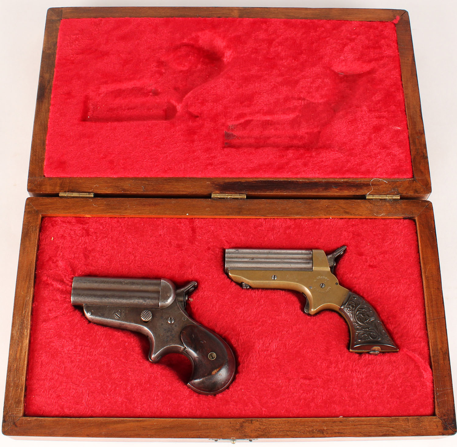 CASED SET OF 2 Sharps 4-Barrel Pepperbox Pistols, 1) C.Sharps, 4-Barrel Pepperbox, CAL: 22, MFG: circa 1860's-81, SN: 52688, Single Action, 2 1/2'' barrels. The carved Gutta Percha grips are excellent, with light wear. The brass frame has a thin aged patina. The barrel have worn to metal gray, with spotting toned to brown patina. Bores are good, with intermittent pitting. Small groove & bead sights. Rotating firing pin appears to function correctly. 2) C. Sharps 4-Barrel Pepperbox, CAL: 32, MFG: 1860's-81, SN: 2683, Single Action, 2 1/2'' barrels. The birdshead wood grips are excellent. There are contusions & dings to the finish. The frame & barrels have evenly worn to a mix of metal gray & brown patina. Bores are fair, with consistent roughness & worn rifling. Groove rear sight, missing blade front sight. The rotating pin rotates twice, then stops. Both pistols come in a custom wood case, with red interior. Antique, No FFL Req. - Value: 1000 to 2000