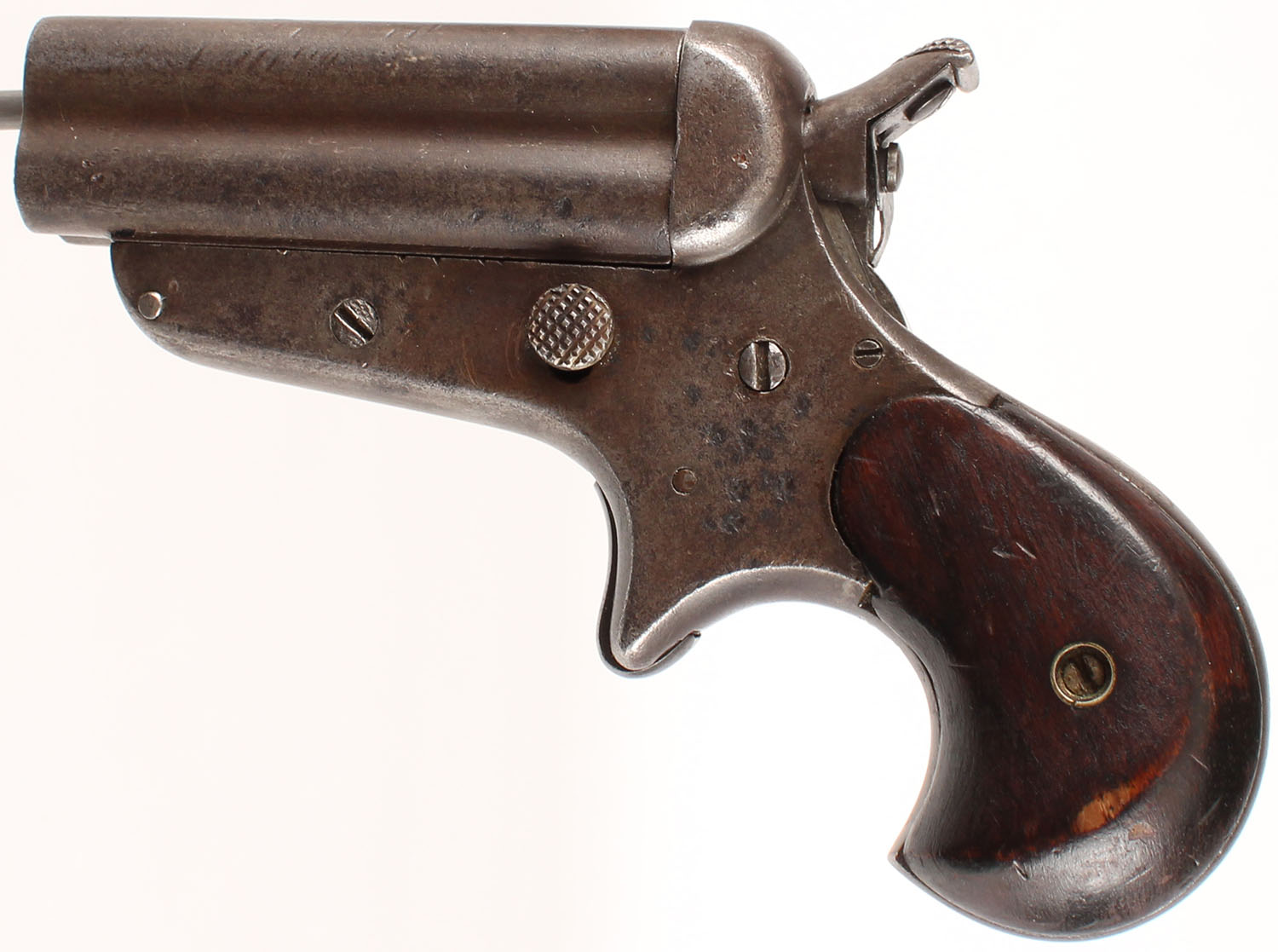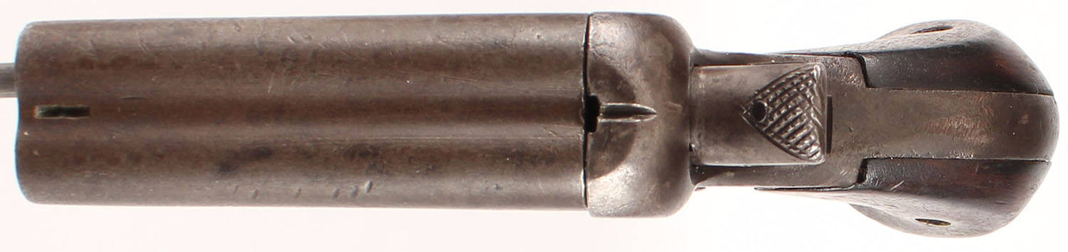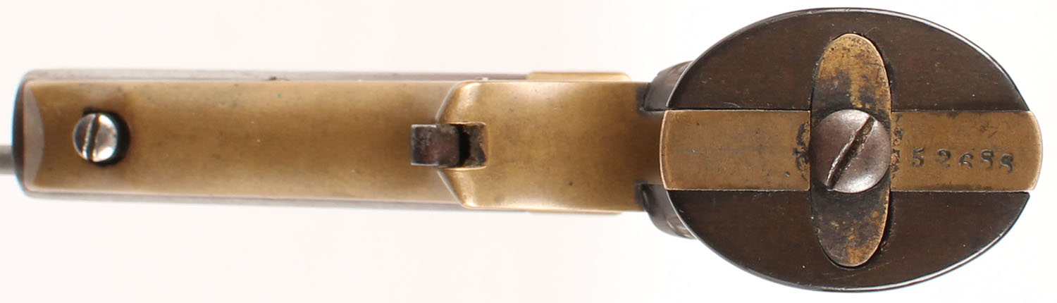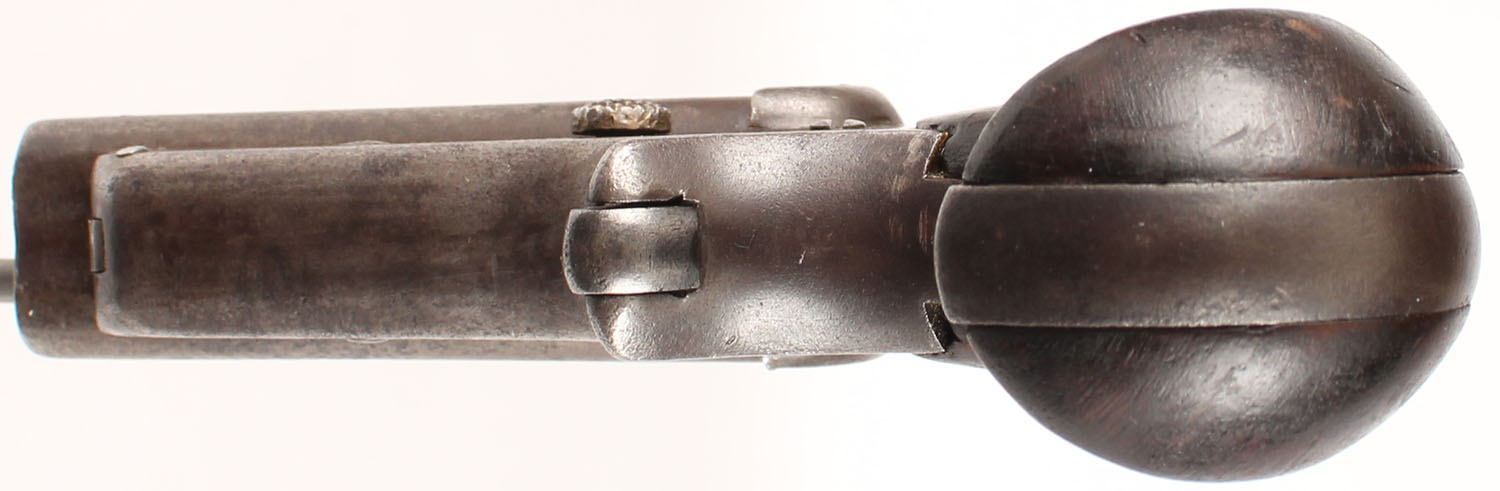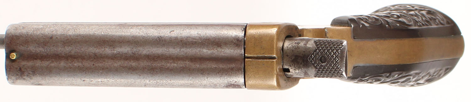 CASED SET OF 2 Sharps 4-Barrel Pepperbox Pistols, 1) C.Sharps, 4-Barrel Pepperbox, CAL: 22, MFG: circa 1860's-81, SN: 52688, Single Action, 2 1/2'' barrels. The carved Gutta Percha grips are excellent, with light wear. The brass frame has a thin aged patina. The barrel have worn to metal gray, with spotting toned to brown patina. Bores are good, with intermittent pitting. Small groove & bead sights. Rotating firing pin appears to function correctly. 2) C. Sharps 4-Barrel Pepperbox, CAL: 32, MFG: 1860's-81, SN: 2683, Single Action, 2 1/2'' barrels. The birdshead wood grips are excellent. There are contusions & dings to the finish. The frame & barrels have evenly worn to a mix of metal gray & brown patina. Bores are fair, with consistent roughness & worn rifling. Groove rear sight, missing blade front sight. The rotating pin rotates twice, then stops. Both pistols come in a custom wood case, with red interior. Antique, No FFL Req. - Value: 1000 to 2000