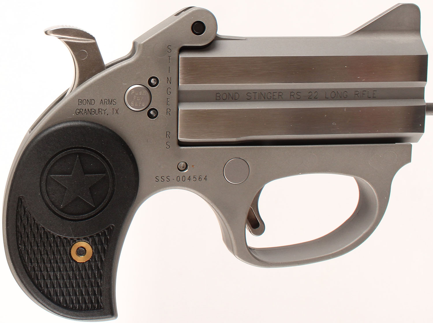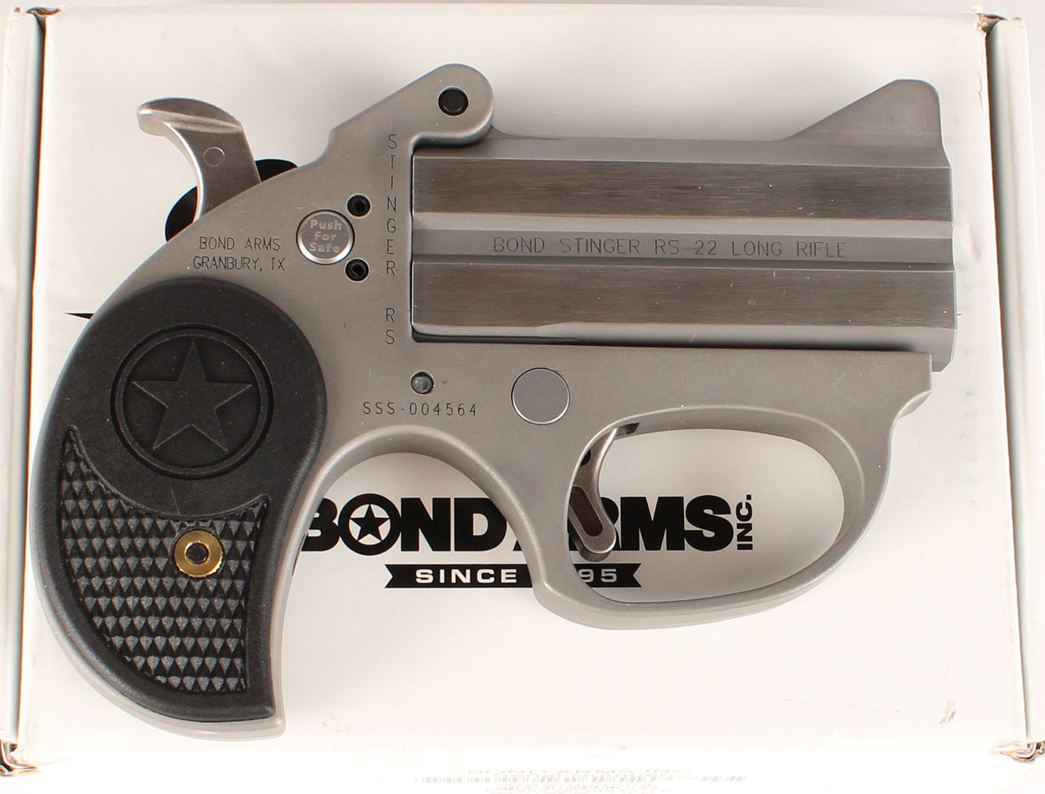 NEW, BOXED, Bond Arms, Stinger RS, CAL: 22LR, MFG: Modern, SN: SSS-004564, Derringer Pistol (O/U), 3'' barrels. The checkered plastic grips are excellent. The satin & stainless steel finish is excellent. Bores are mint. Factory notch & blade sights. Comes in factory box, with related paperwork. FFL Req. - Value: 200 to 300