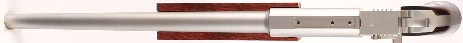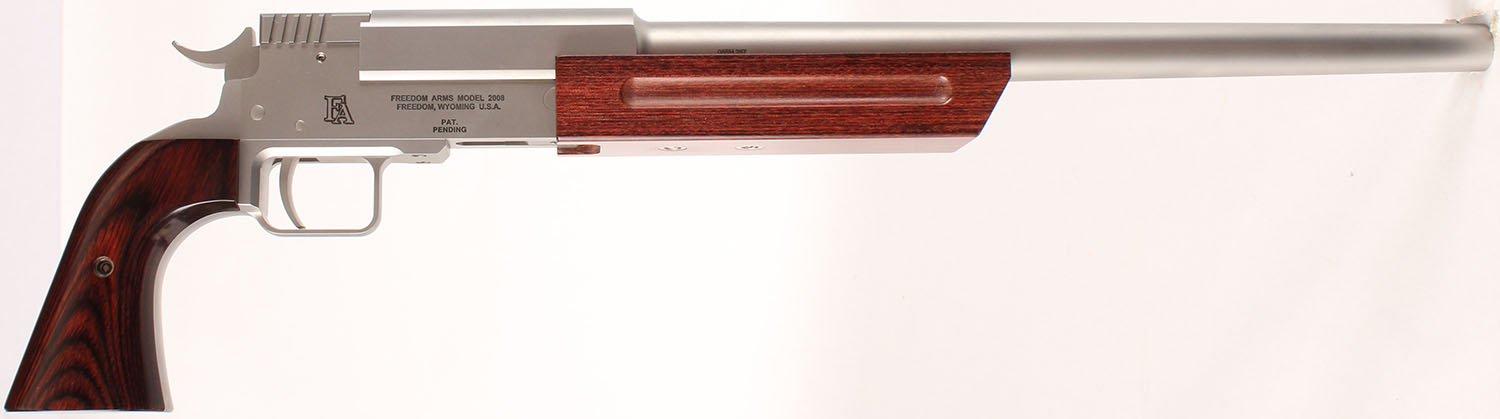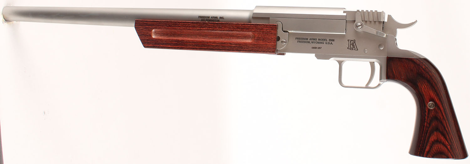BOXED, Freedom Arms, Model 2008, 3-Barrel Set, CAL: .223, .260 REM & 454 Casull, MFG: Modern, SN: 08SH257 (matching SN on extra barrels), Break Action Single Shot, 15'' barrel (extra barrels 15'' & 16''). The rosewood grips & forend are excellent. The stainless steel finish is excellent overall. All bores are excellent. The top of the barrels are tapped & drilled, with (3) open screw holes. The .260 barrel is blank & the 454 barrel has an adjustable rear sight & large hood front sight. The firearm & barrels come in their own separate factory boxes, with owners manual. This gun retails for $1,800 & each additional barrel is $640. FFL Req. - Value: 2000 to 3000