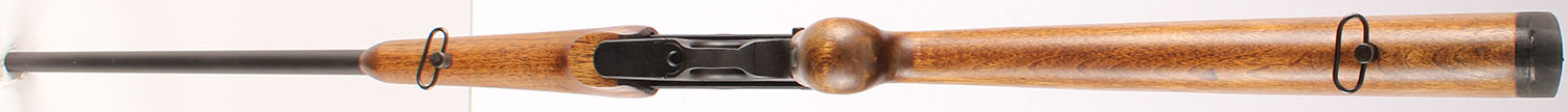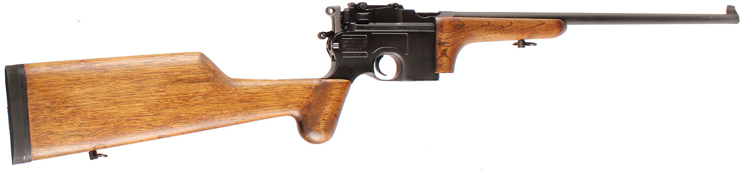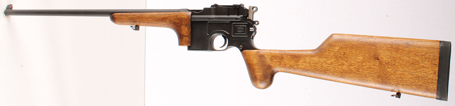 SCARCE Waffenfabrike Mauser, Model C96 Broom handle Carbine, Cal. 7.63x25 mm, Mfg. 1930's, S/N: 2412, Semi-Auto Carbine, 16'' barrel, Small ring hammer. The Broomhandle Mauser Model 1896 was one of the most distinctive pistols ever manufactured. Most were made with pistol length barrels & the grip frames were slotted for attachment to shoulder stocks. Ladder sights from 0-500 meters & 0-1000 meters were the standard. However, in their book ''System Mauser'', Breathed & Schroeder show several photographs of carbines manufactured from the 1890s up to the early 1900s in different configurations, (small ring hammer, large ring hammer, flat side cone hammer, etc.). Most of the early carbines have barrel lengths of 11.75'', but some of the later carbines had barrel lengths of 14.5'' & 16''. This example is a commercially produced replica made from a 1930's commercial model. It has a ''Mauser'' banner on left side of frame, with SN stamped below that. Chamber is marked with a 3-line address, ''WAFFENFABRIK MAUSER OBERNDORF A/N''. Left side of receiver is stamped ''WAFFENFABRIK MAUSER OBERNDORF A NECKAR D.R.P.U.A.P.'' Metal components are flat gray rust blued rating 98%, with areas of rust pitting under the finish. The wood stocks are excellent, with few handling scuffs. The stock is removed for take-down storage by pushing a spring loaded plunger located on the left side of the mounting bracket above the pistol grip & then stock & mounting bracket is slide apart from the fore-aft dovetailed slot. This example has a square blade front sight & a V-notch 50-1000 adjusting rear sight. Integral box mag. Excellent bore. Black solid rubber recoil pad. Sling swivels. A very unique & rare Mauser Broomhandle variation, which is highly sought after amongst collectors. FFL or C&R Req. - Value: 1500 to 4000