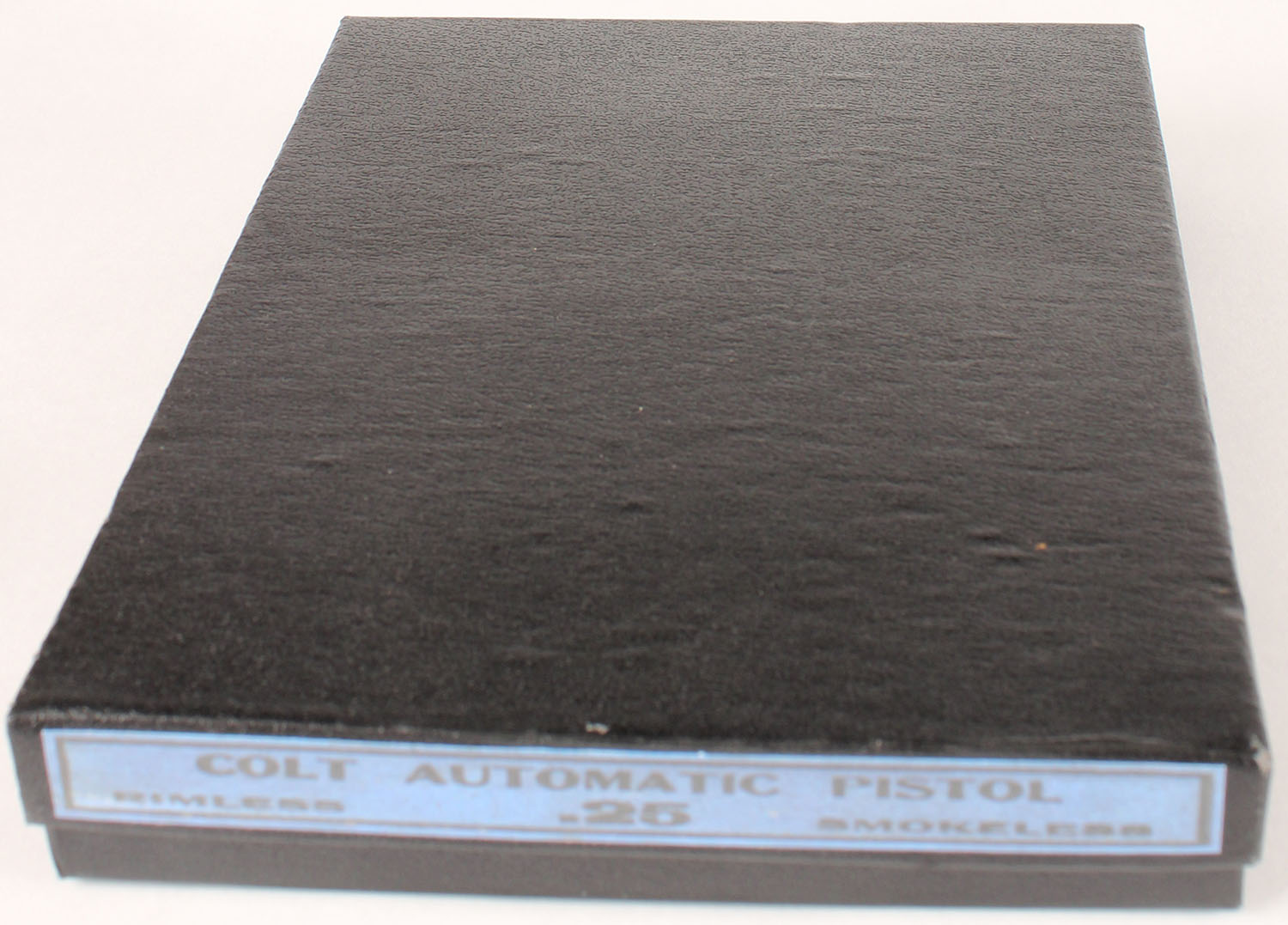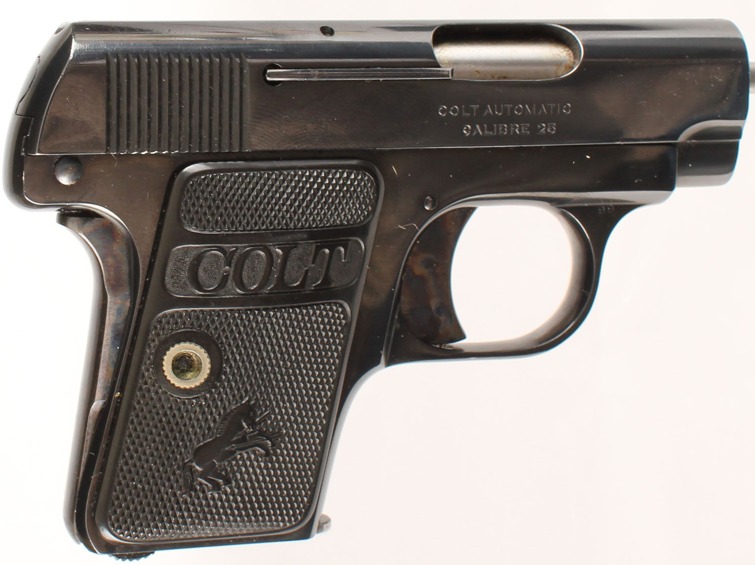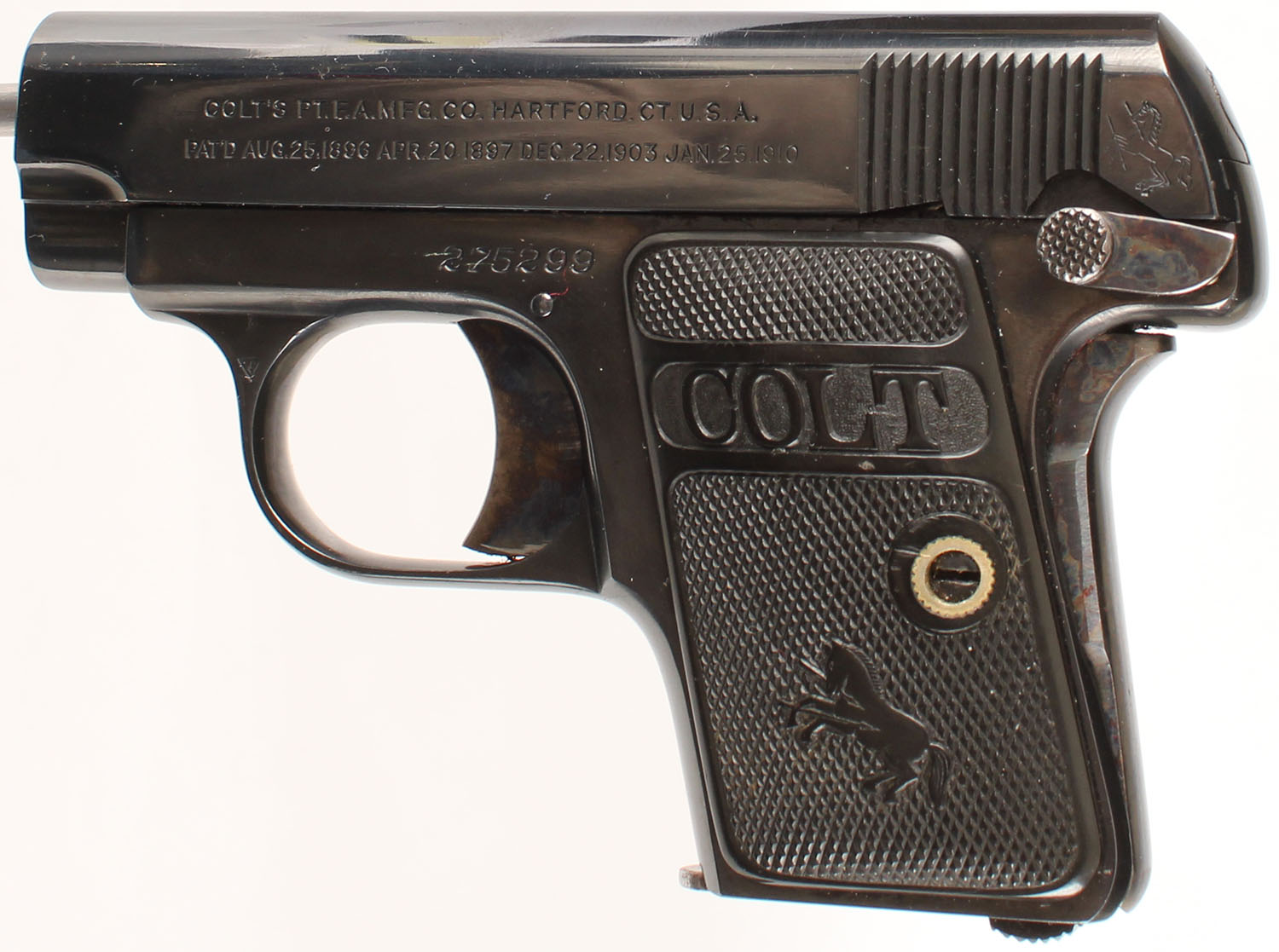 Colt, Model 1908, CAL: 25, MFG: 1920, SN: 275299, Semi Auto Pistol, 2'' barrel. The Colt marked & Rampant Colt checkered plastic grips are excellent. The metal blue finish rates 97% overall. The case-hardened trigger, grip safety & slide stop all retain vivid case colors. Bore is excellent. Groove sights. Comes in non-factory box, with Colt copied labels taped to the inside. FFL or C&R Req. - Value: 600 to 900