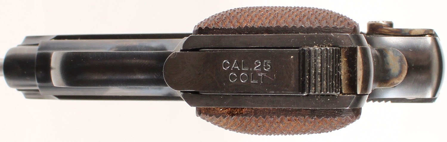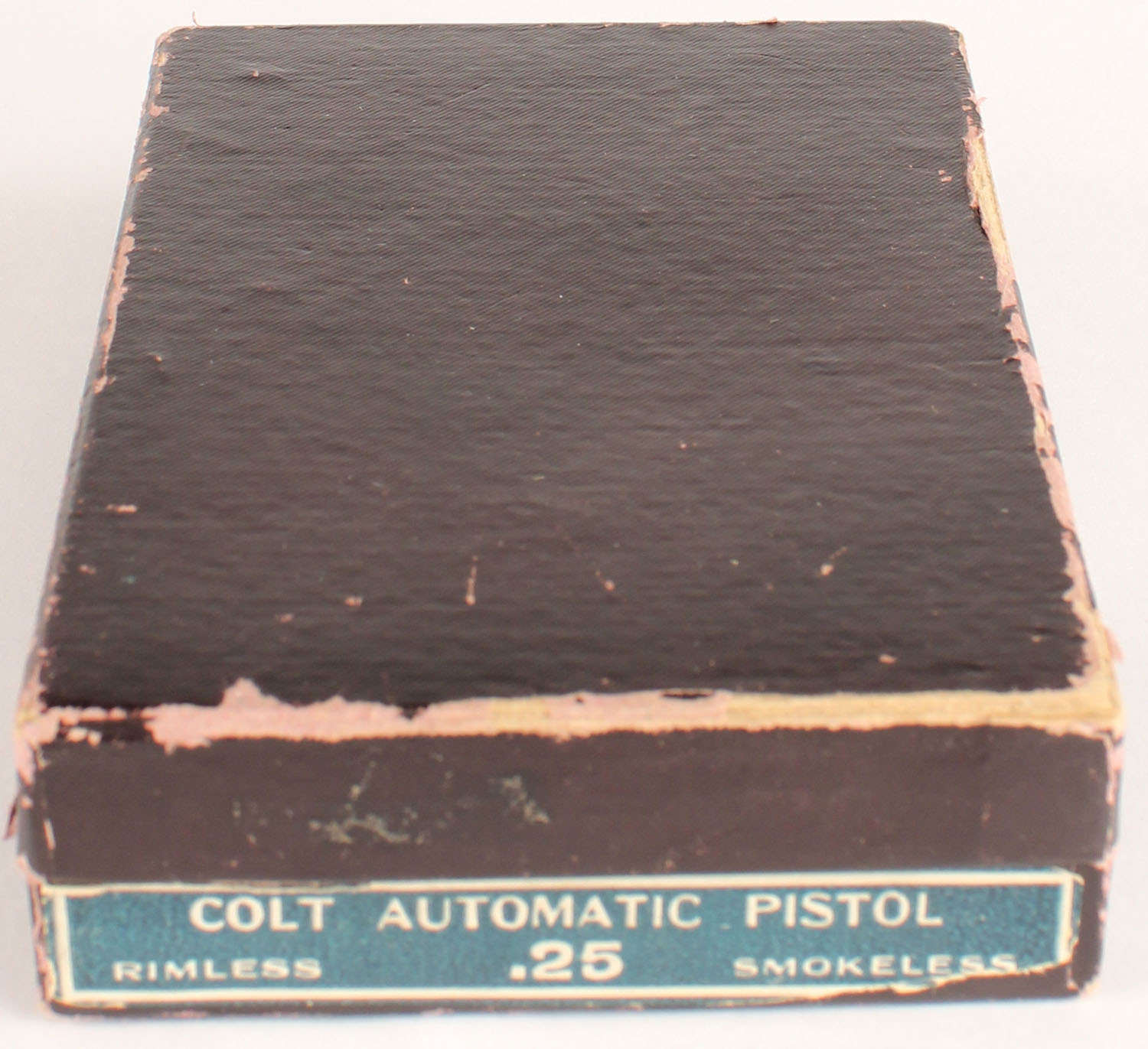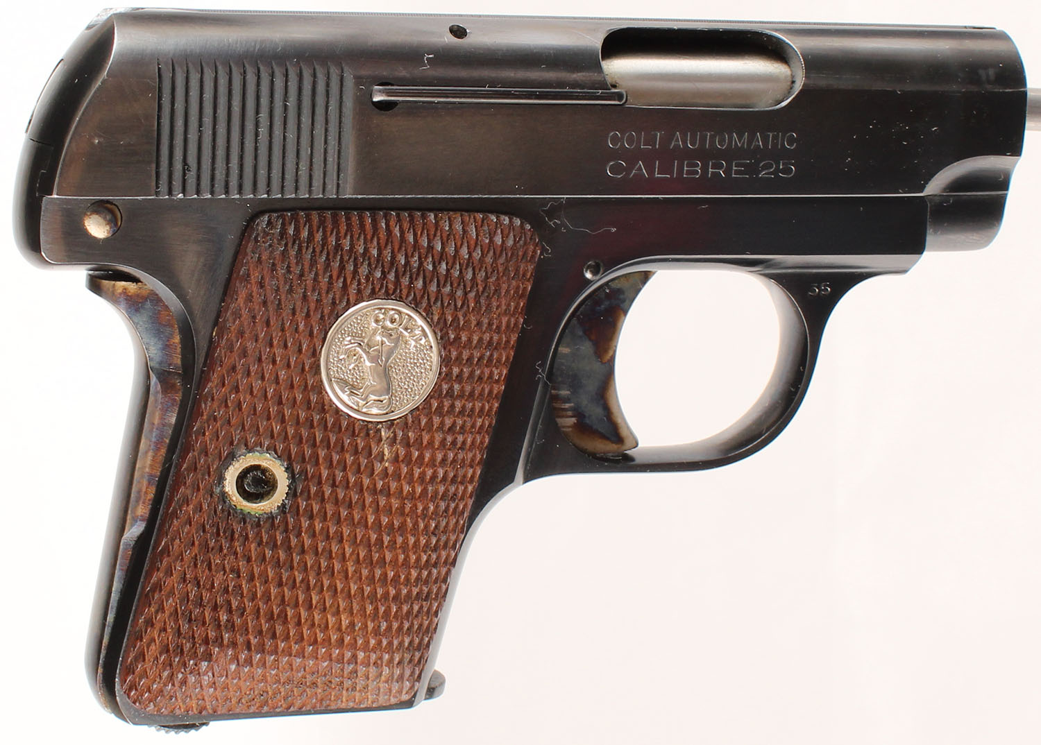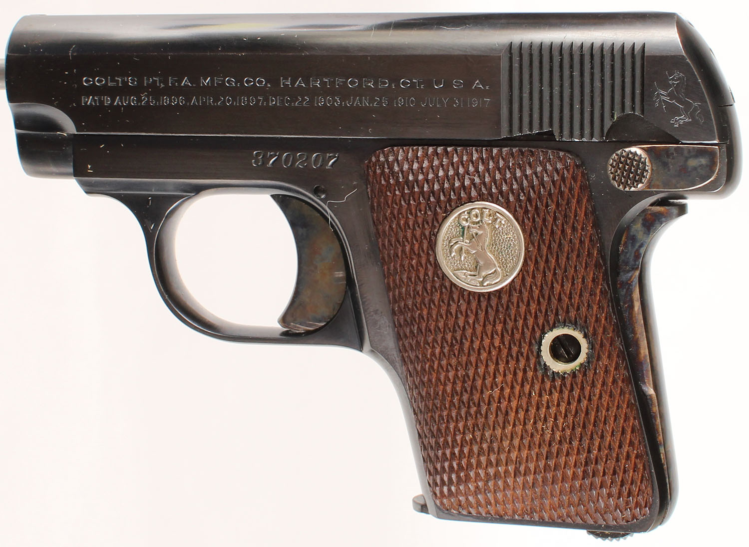 BOXED, Colt, Model 1908 Automatic Pocket, CAL: 25, MFG: 1928, SN: 370207, Semi Auto Pistol, 2'' barrel. The Colt logo medallion checkered wood grips are excellent. The original metal blue finish rates 97% overall. The case-hardened trigger, grip safety & slide lock all retain vivid case-colors. Bore is excellent. Groove & blade sights. Comes in original SN matching box, with paperwork. FFL or C&R Req. - Value: 500 to 1000