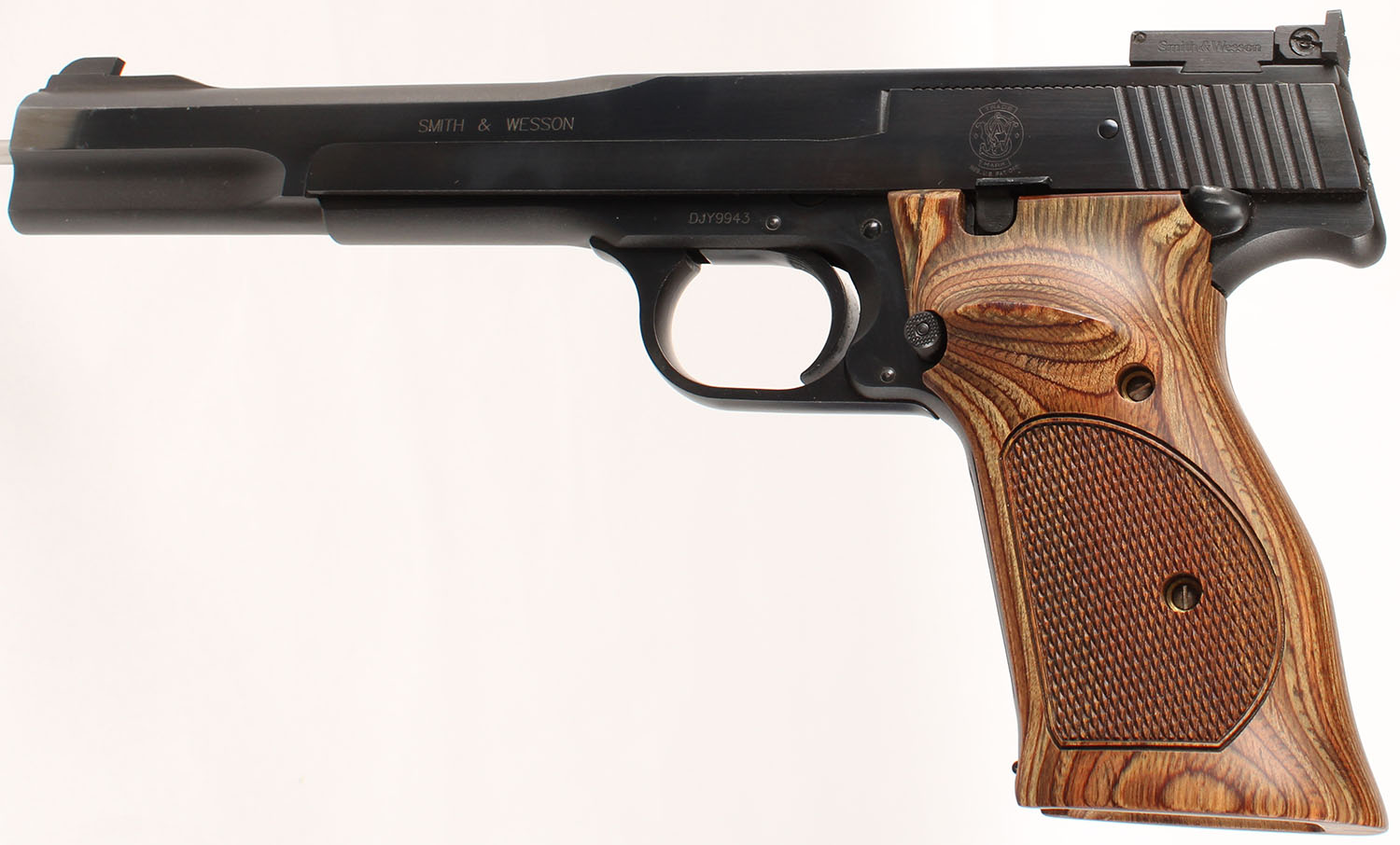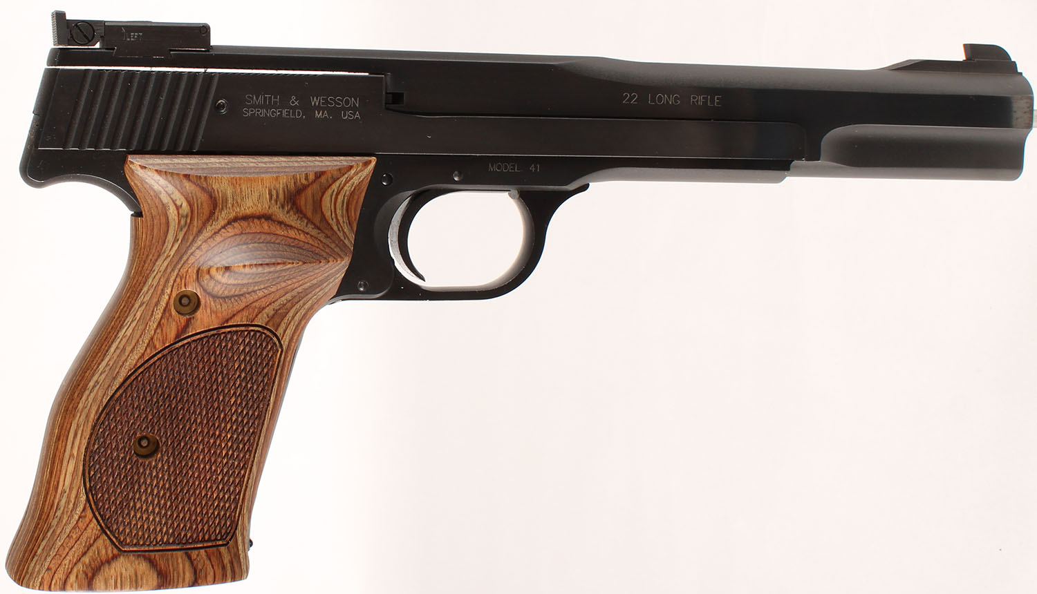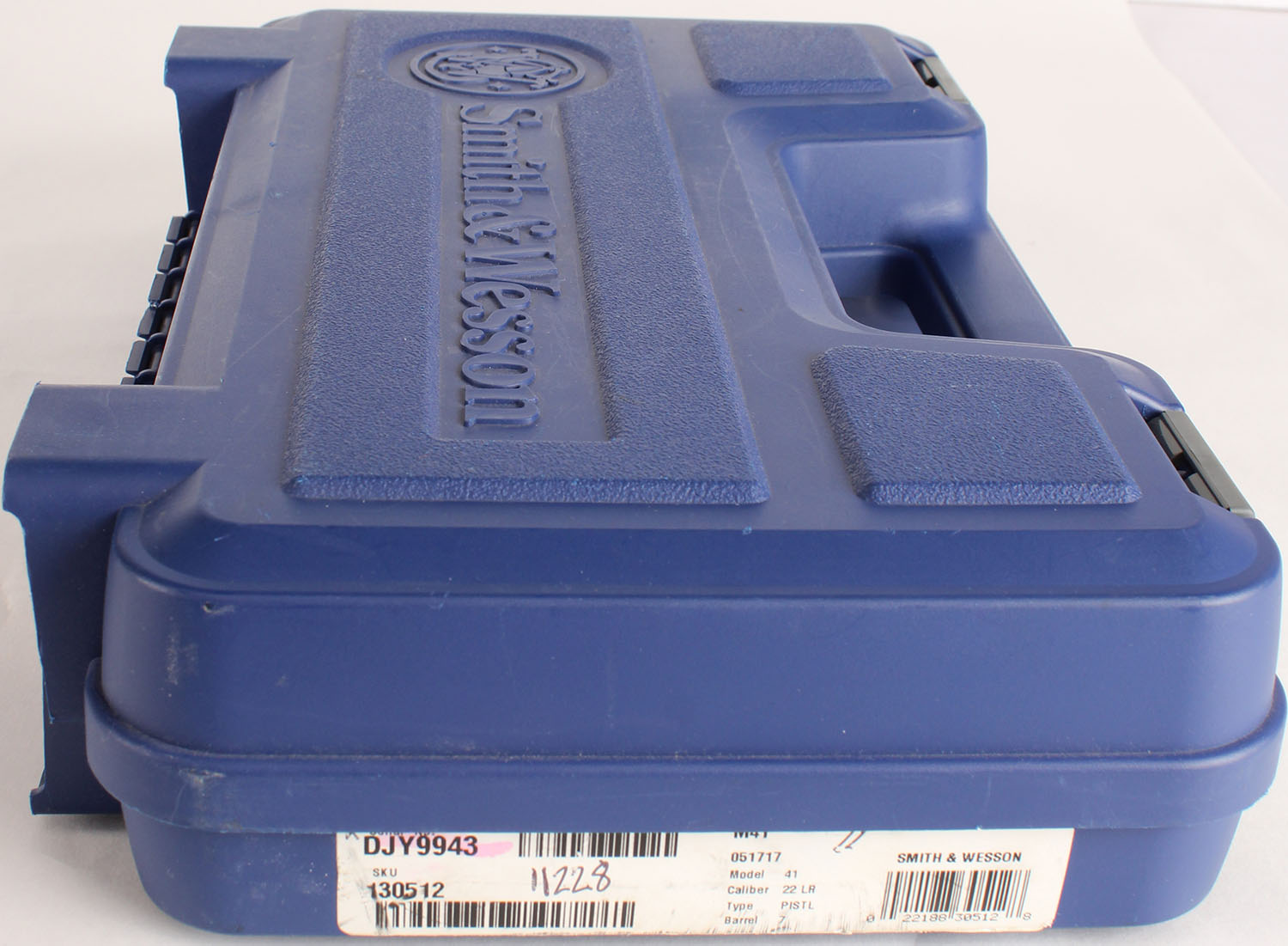 CASED, Smith & Wesson, Model 41, CAL: 22 LR, MFG: Modern, SN: DJY9943, Semi Auto Pistol, 7'' barrel. The laminated & checkered target grips are excellent. The metal blue finish rates 99%+ overall. Bore is excellent. Adjustable rear target sight & ramp elevated blade front sight. Comes in original blue hard case, with extra mag, related paperwork & lock. FFL Req. - Value: 1000 to 1300