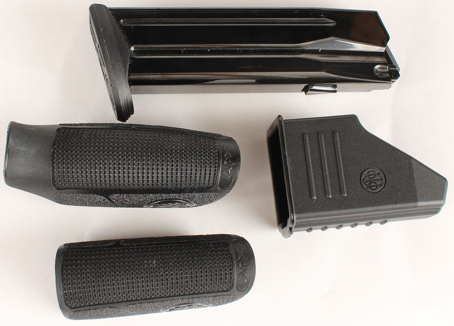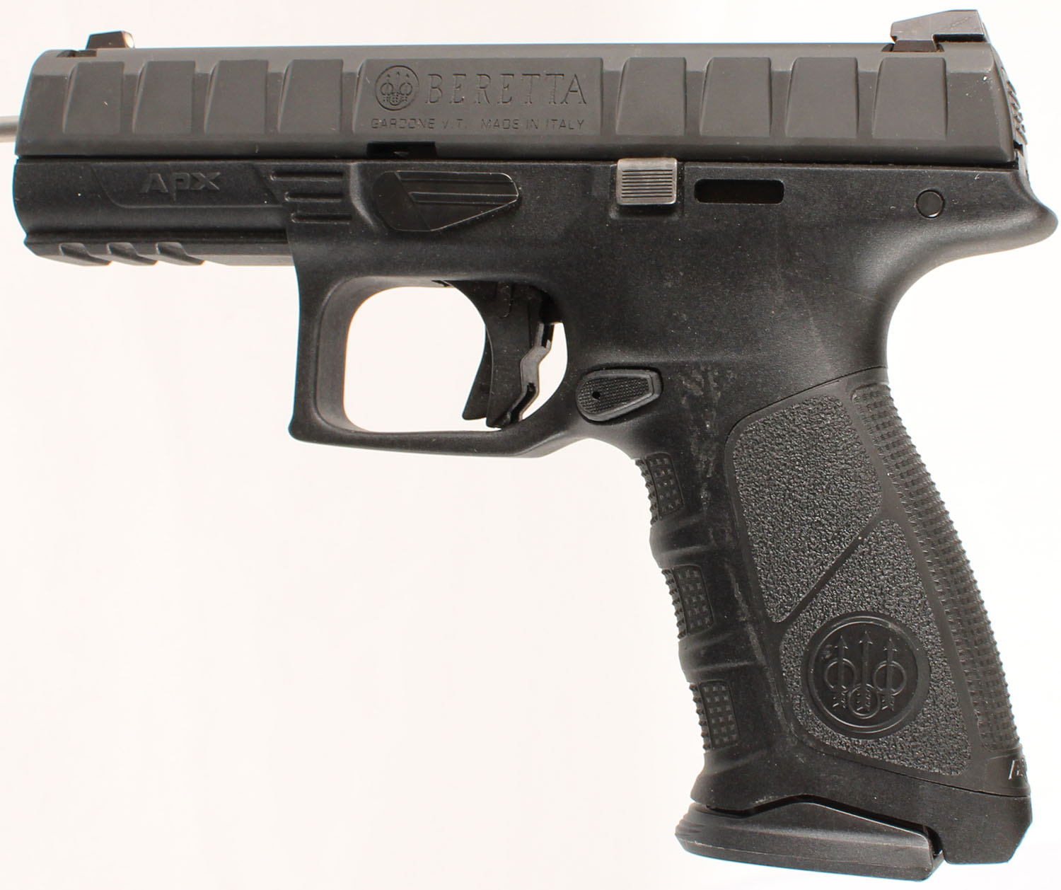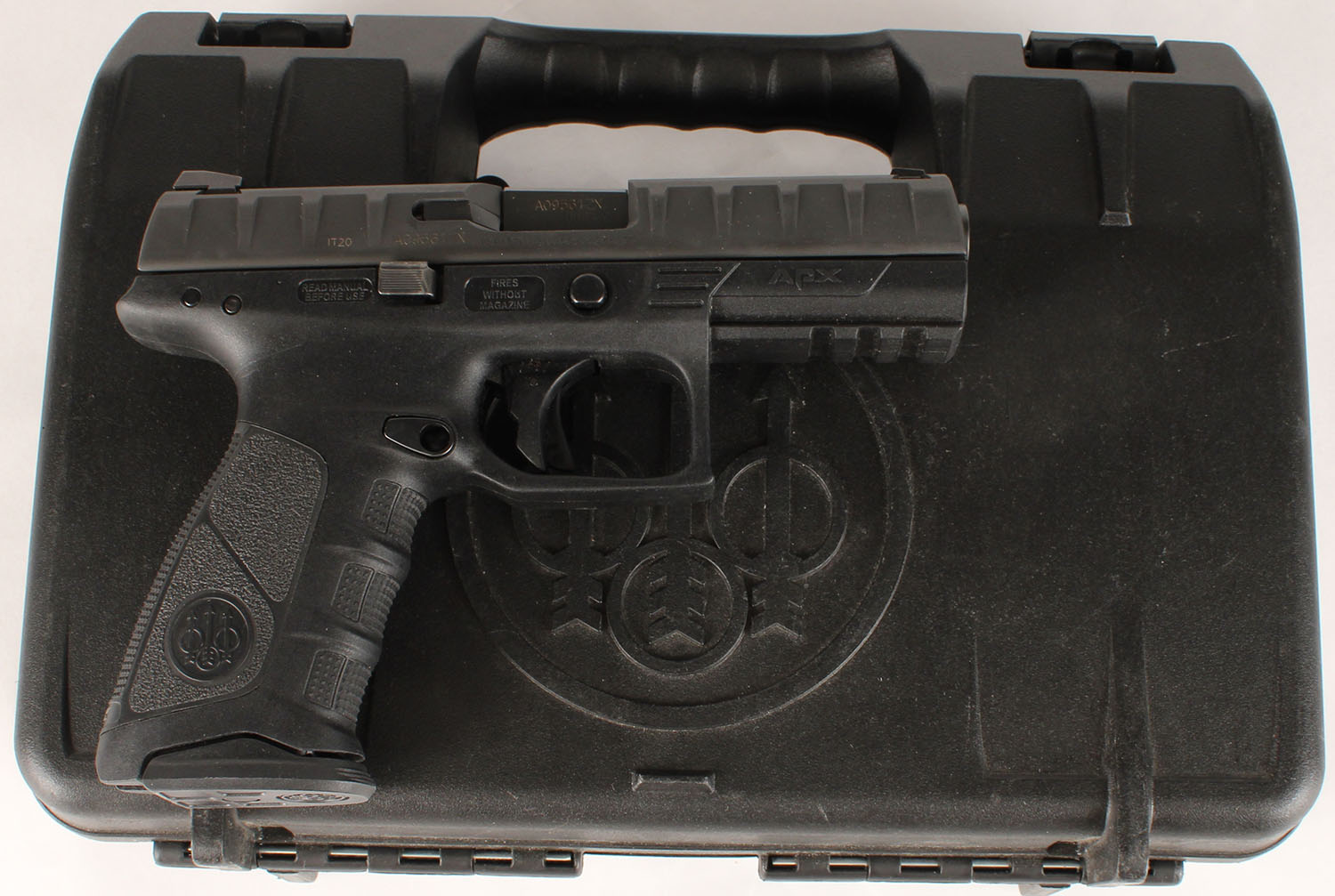 Beretta, Model APX, CAL: 9mm, MFG: Modern, SN: A095617X, Semi Auto Pistol, 4 1/8'' barrel. The Beretta marked Techno polymer frame is excellent. The matte black finish on the slide is excellent, rating 99%. Bore is near mint. Factory sights. Comes in the original hard case, with the owners manual, cleaning brush, lock, extra mag, extra grips & speed loader. FFL Req. - Value: 250 to 400
