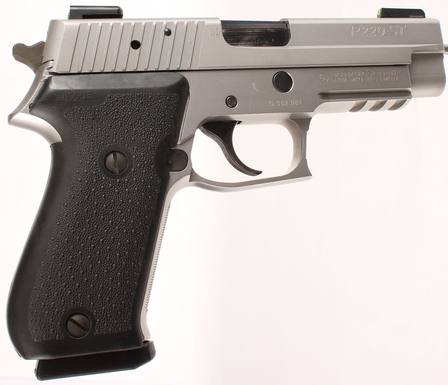 CASED, Sig Sauer, P220 ST, CAL: 45 ACP, MFG: Modern, SN: G352981, Semi Auto Pistol, 4 1/4'' barrel. The Hogue textured grips are excellent. The stainless steel finish is excellent. There are a couple minor handling marks & scuffs. Bore is excellent. The slide holds TruGlo Tritium Night Sights. Comes in factory blue hard case, with related paperwork, hang tang, lock/key, cleaning brush & patches. FFL Req. - Value: 600 to 1000