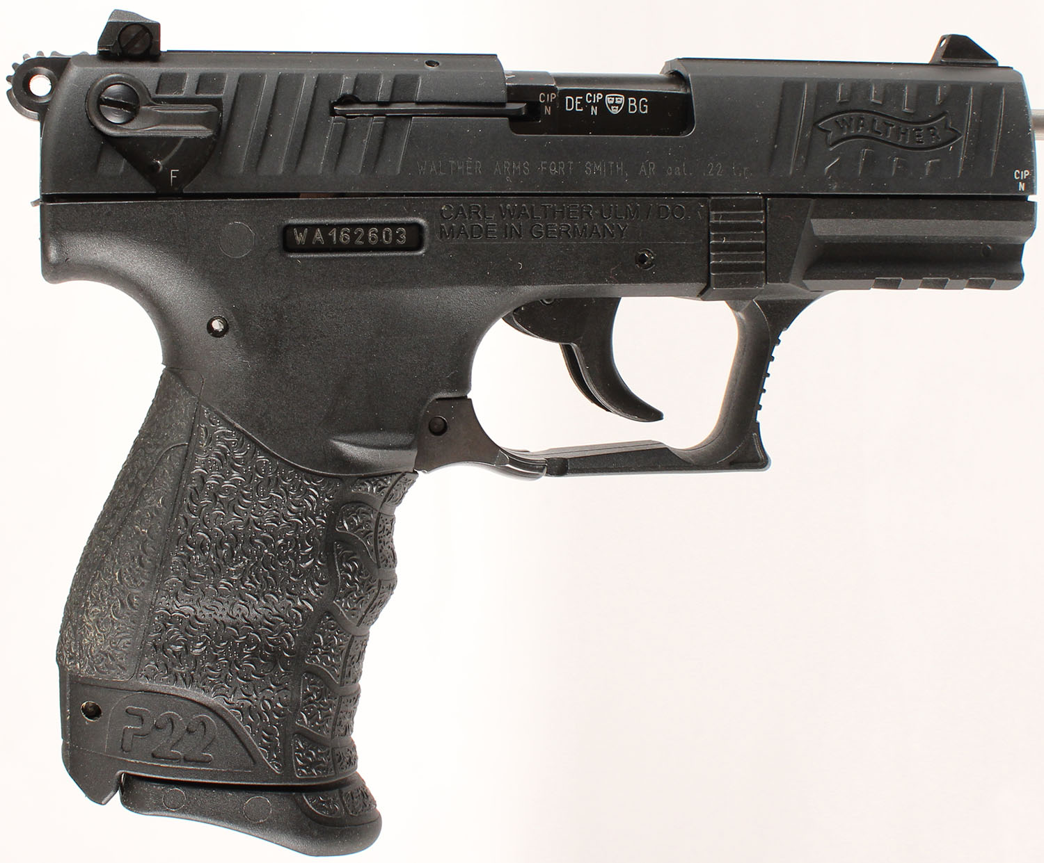 CASED Walther, P22 CA (California Compliant), CAL: 22 LR, MFG: Modern, SN: WA162603, Semi Auto Pistol, 3 3/8'' barrel. The textured polymer grip frame is excellent. The metal blue finish on the slide rates 98%. There is minor wear on the top of the chamber. Bore is excellent. The slide holds a dual white dot rear sight & single white dot blade front sight. Comes in original hard case, with (1) additional mag, speed loader & owners manual. FFL Req. - Value: 200 to 400