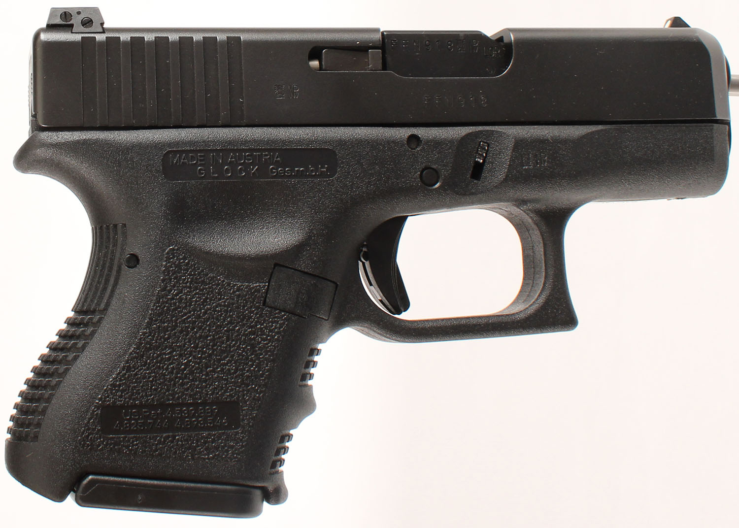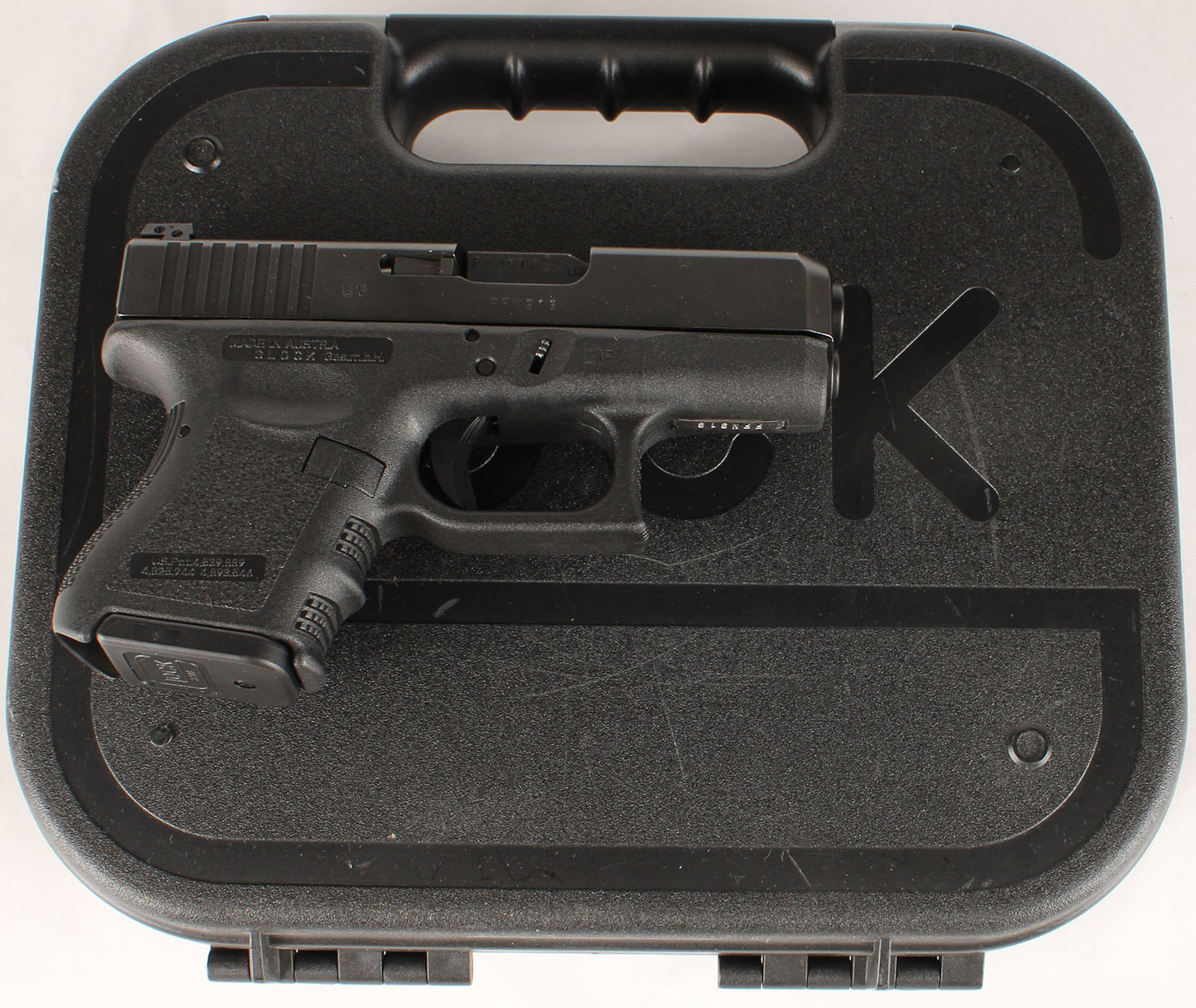 NEW CASED, Glock, Model 28 Gen 3, CAL: 380 Auto, MFG: Modern, Semi Auto Pistol, 3 1/4'' barrel. The textured polymer grip & frame are mint. The factory matte black finish is mint. Bore is mint. Factory rear U night sight & front dot night sight. Comes in factory hard case, with owners manual, lock/key, cleaning rod, (2) 10rd mags & speed loader. NOS. FFL Req. - Value: 300 to 500