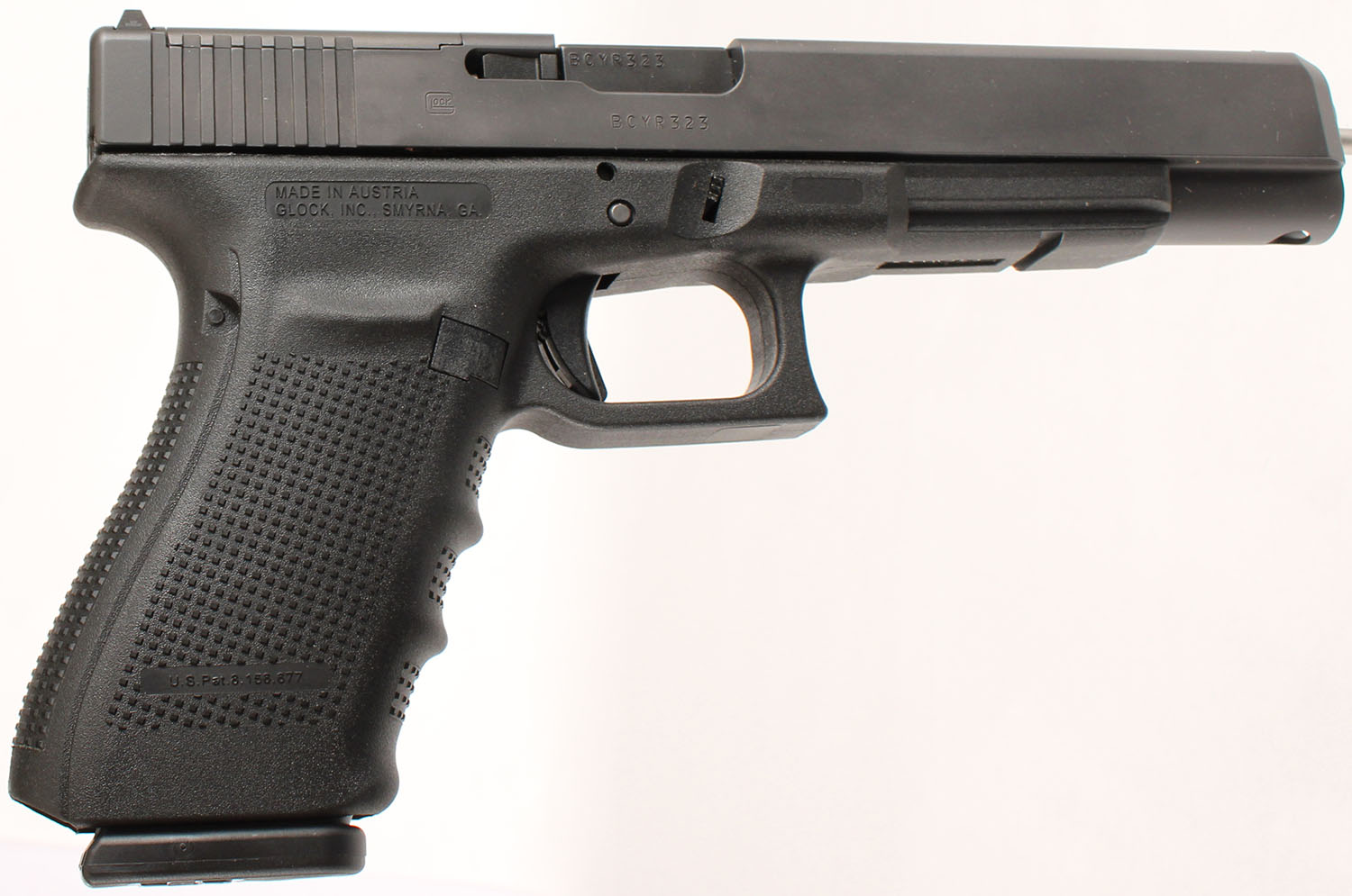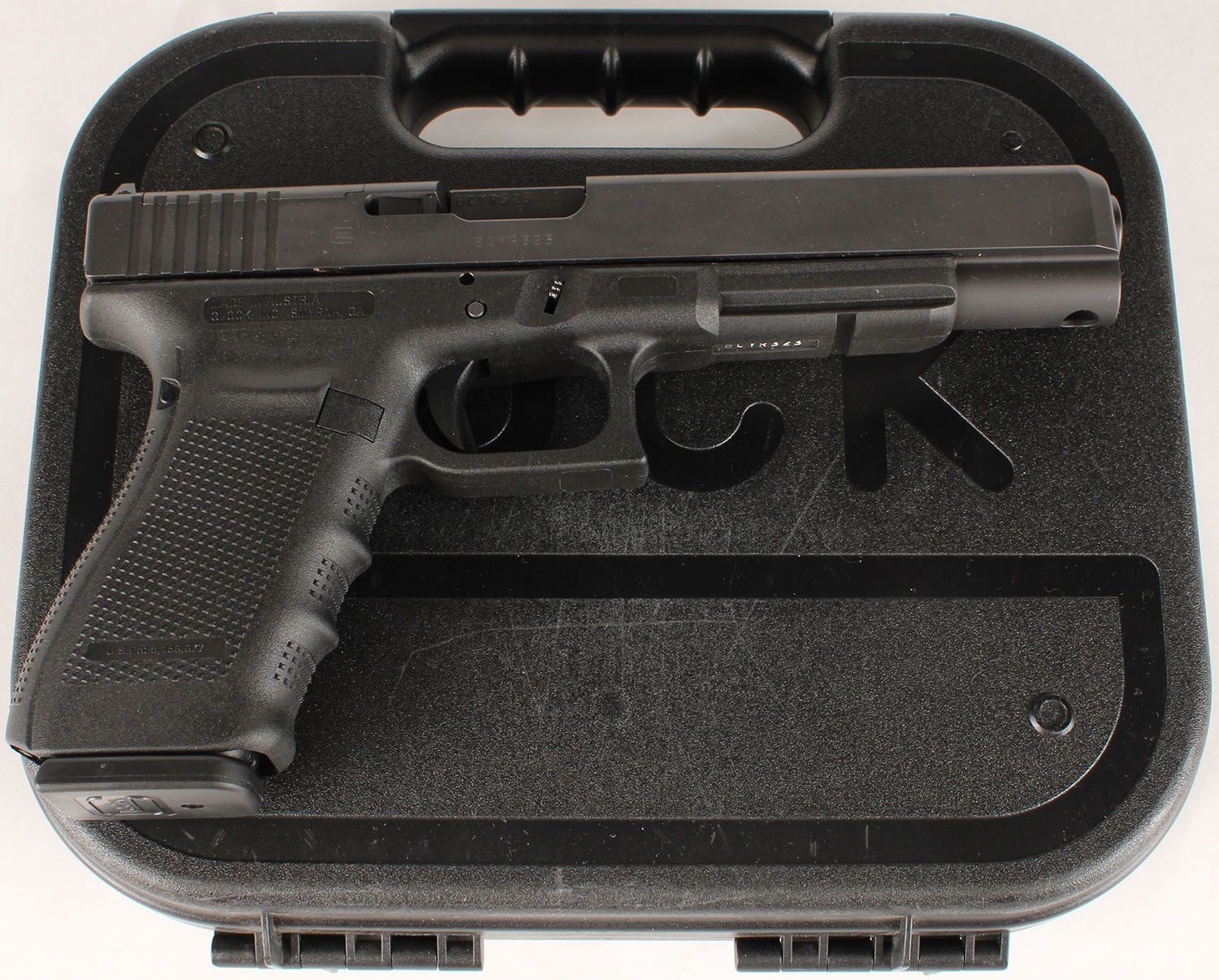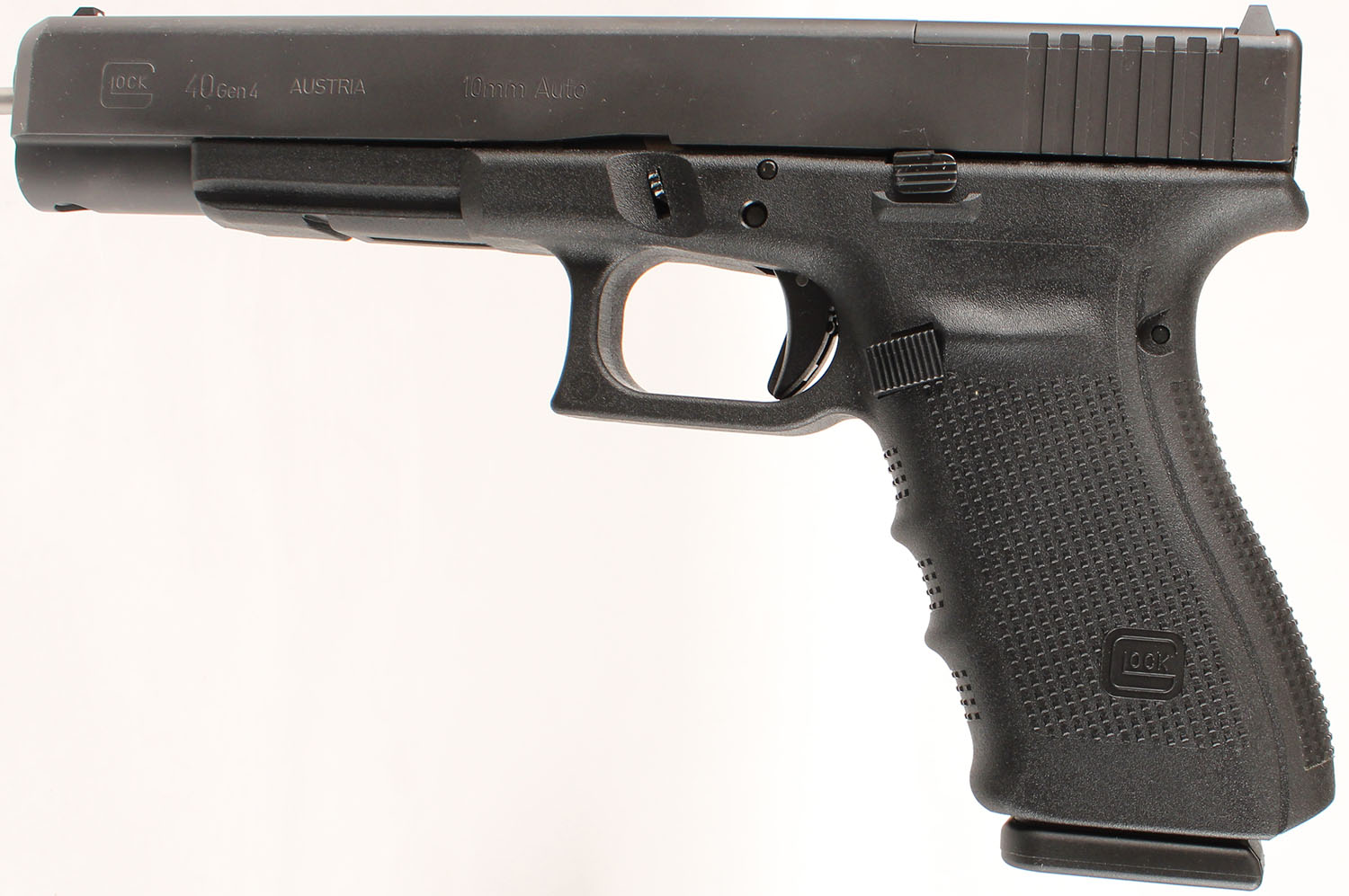 NEW CASED, Glock, Model 40 Gen 4 MOS capable, CAL: 10mm, MFG: Modern, SN: Bcyr323, Semi Auto Pistol, 6'' barrel. The textured polymer grip & frame are mint. The factory matte black finish is mint. Bore is mint. Factory square notch white rear sight & single white dot front sight. Comes in the original factory hard case, with owners manual, lock/key, cleaning rod & brush , 4 grip attachments, (3) 15rd mags & speed loader. NOS. FFL Req. - Value: 500 to 800