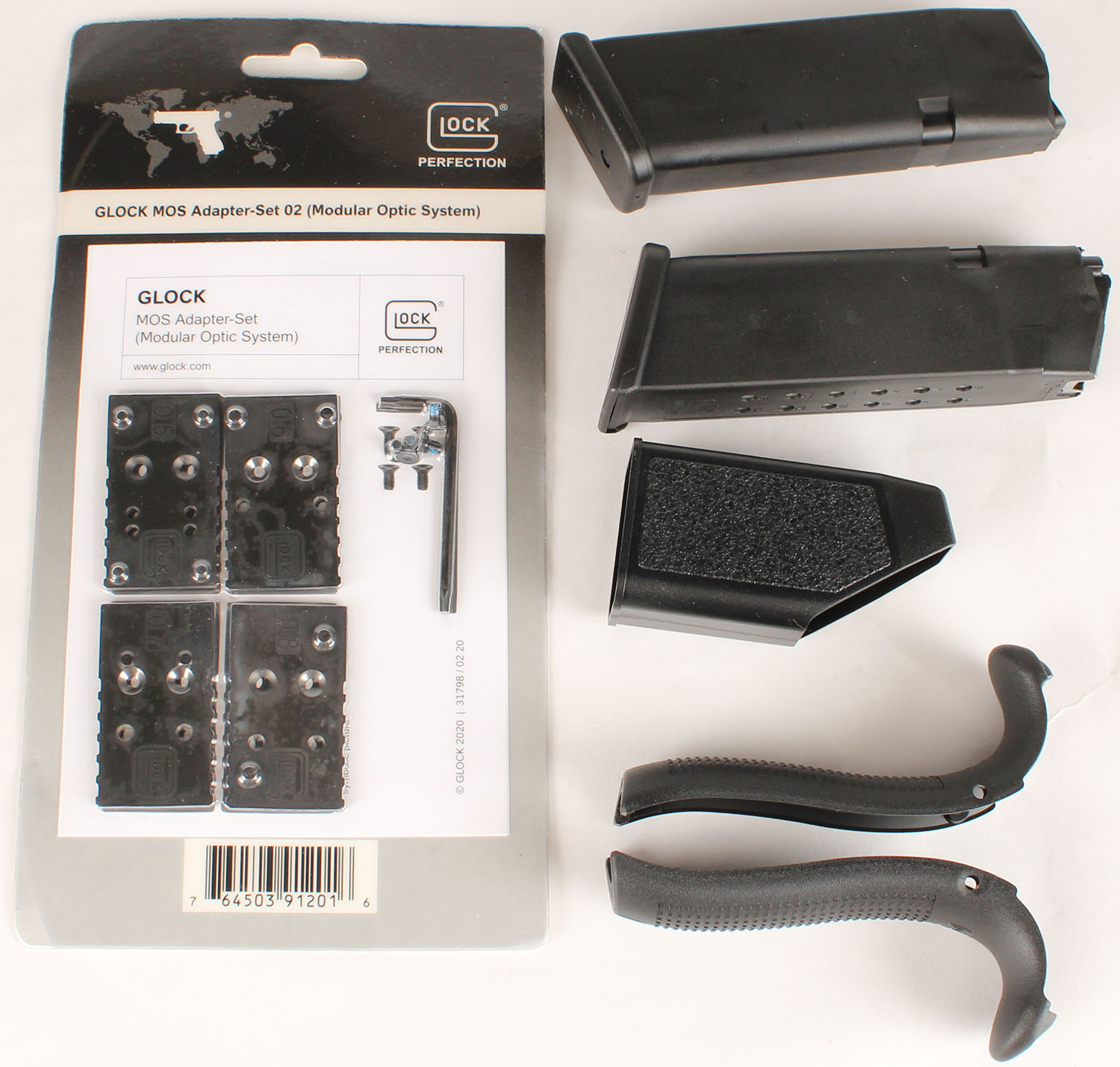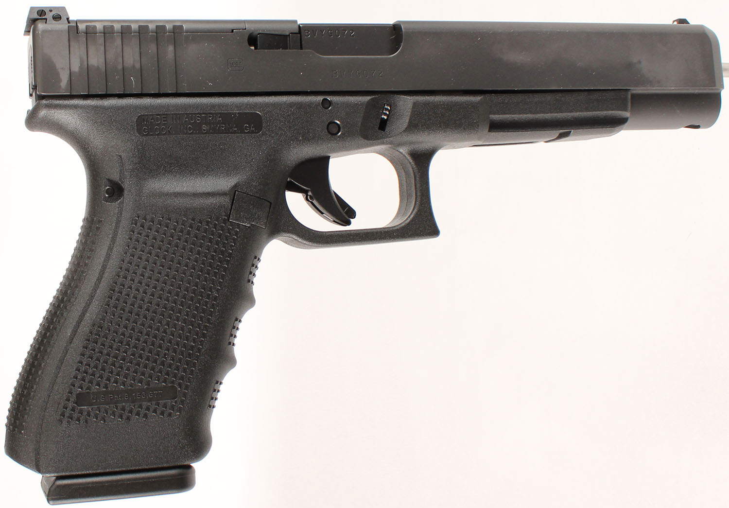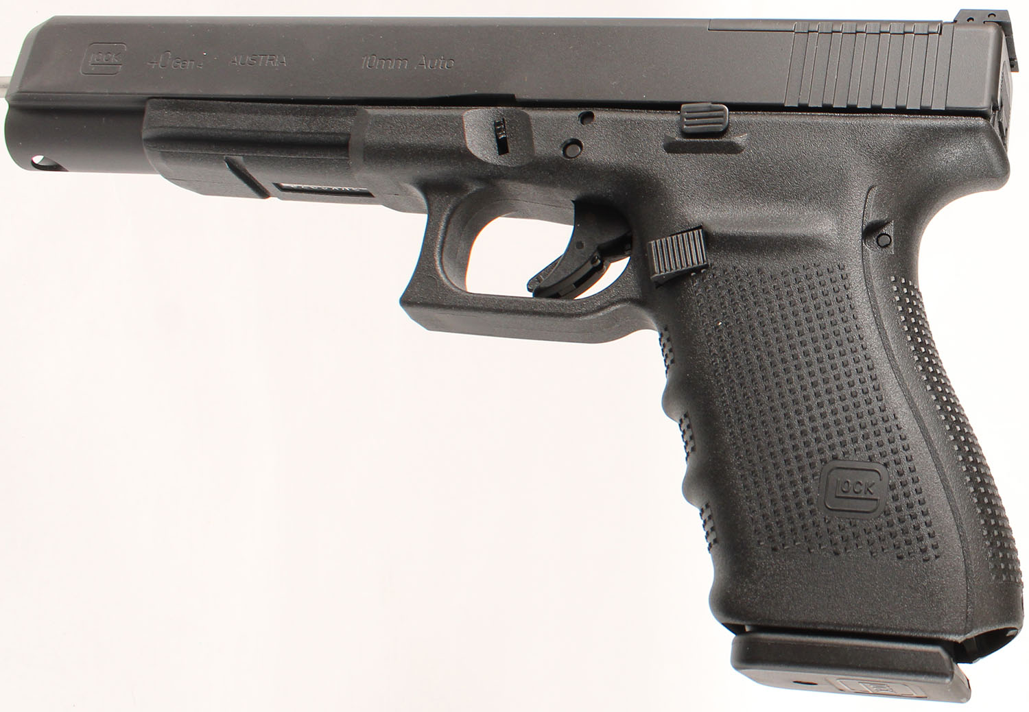 NEW CASED, Glock, Model 40 Gen 4 MOS, CAL: 10mm, MFG: Modern, SN: BVYG072, Semi Auto Pistol, 6'' barrel. The textured polymer grip & frame are mint. The factory matte black finish is mint. Bore is mint. Factory square notch white rear sight & single white dot front sight. Comes in the original factory hard case, with owners manual, lock/key, cleaning rod, 2 grip attachments, MOS Adapter Set 02, (3) 15rd mags & speed loader. NOS. FFL Req. - Value: 600 to 900
