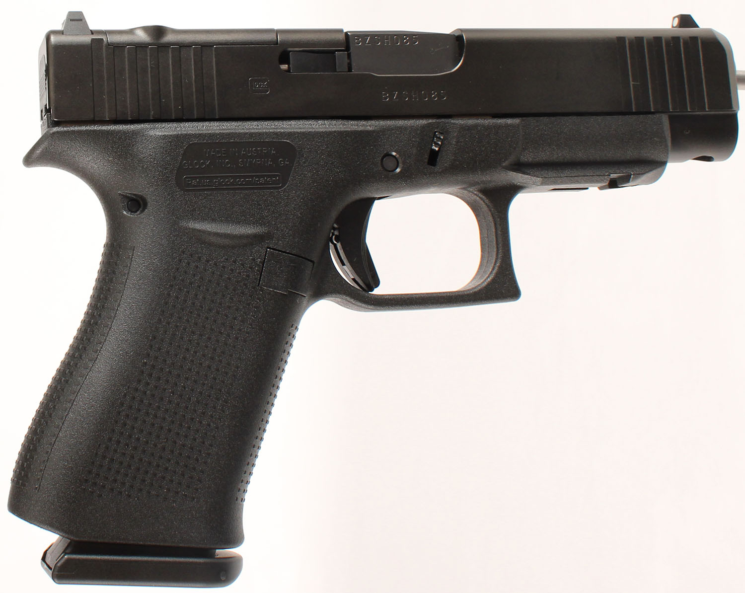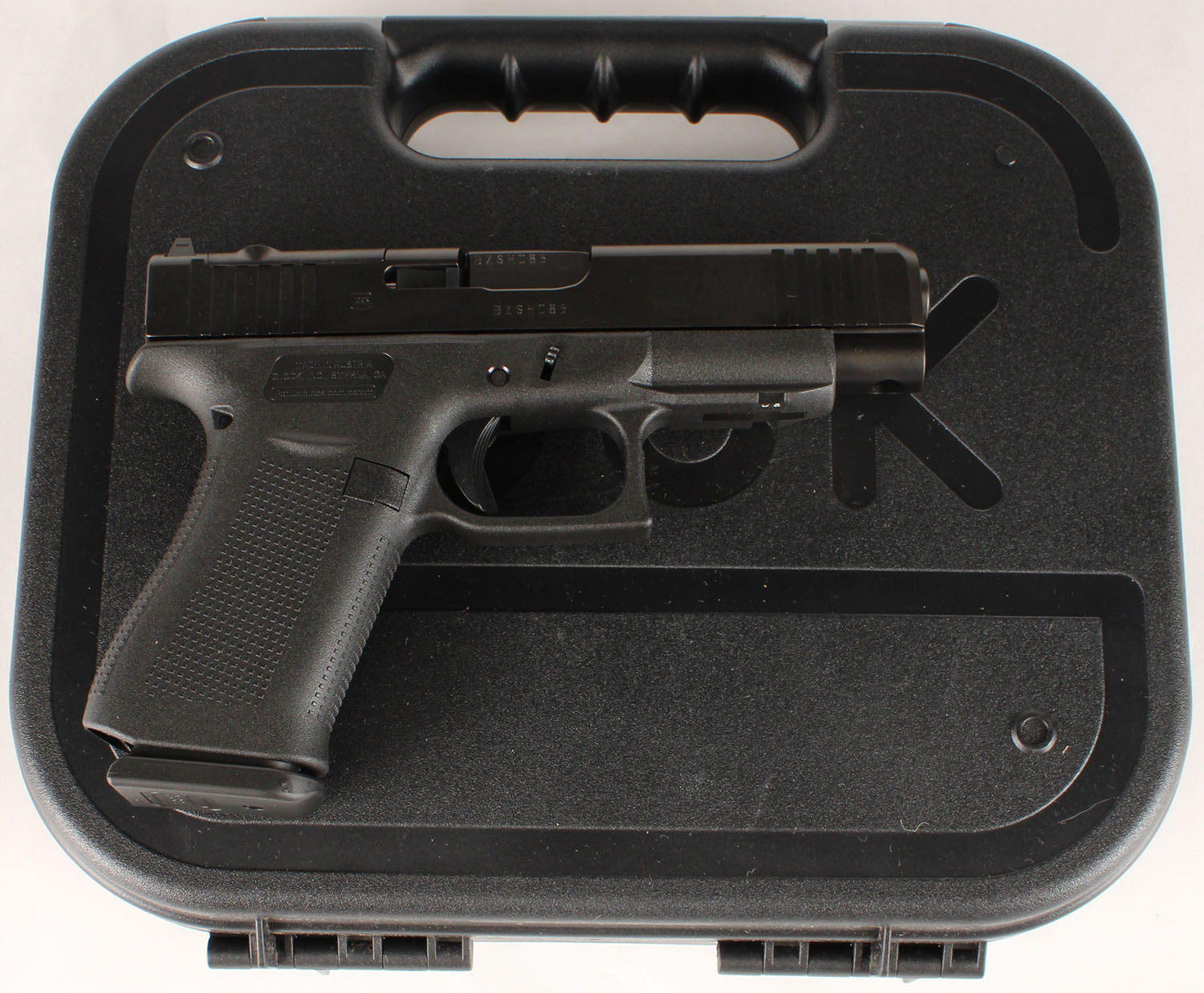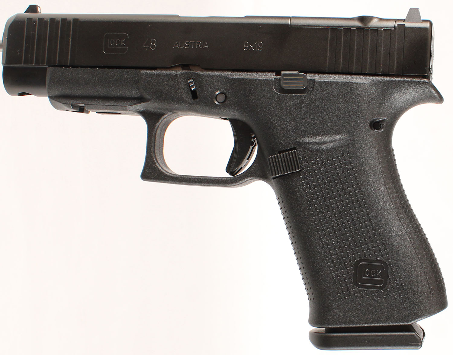 NEW CASED, Glock, Model 48 Gen 5, MOS capable, CAL: 9mm, MFG: Modern, SN: BZSH085, Semi Auto Pistol, 4'' barrel. The textured polymer grip & frame are mint. Bore is mint. Factory white U rear night sight & single white dot front sight. Comes in factory hard case, with owners manual, lock/key, cleaning rod & brush, (2) 10rd mags & speed loader. NOS. FFL Req. - Value: 450 to 550