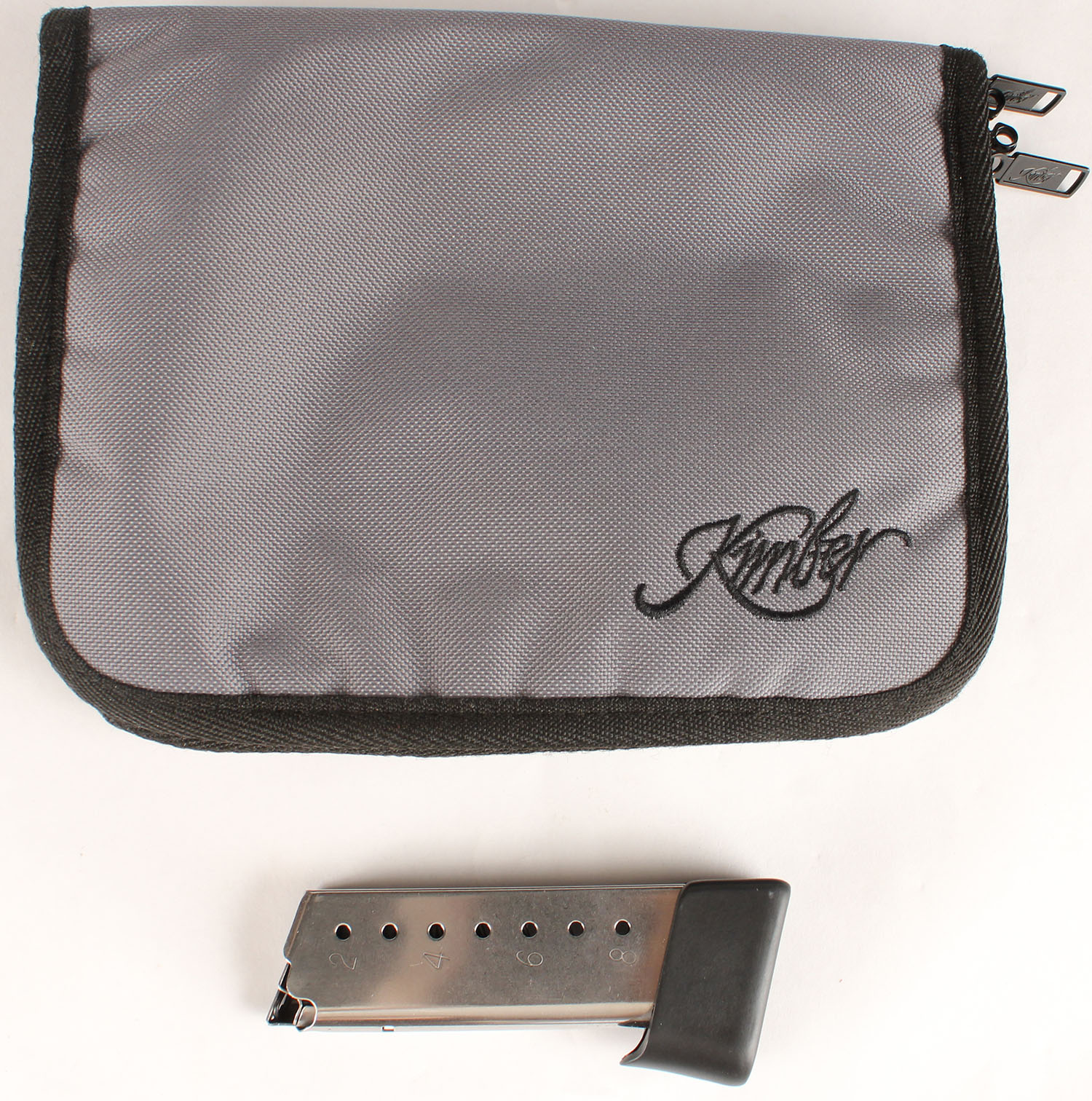 Kimber, Solo Carry STS, CAL: 9mm, MFG: Modern, SN: S1136737, Semi Auto Pistol, 2 3/4'' barrel. The Crimson Trace checkered grips are excellent. The stainless steel finish is excellent overall, with minor storage marks. Bore is excellent. Factory white dot sights. Comes in Kimber marked soft case, with extra mag. FFL Req. - Value: 400 to 600