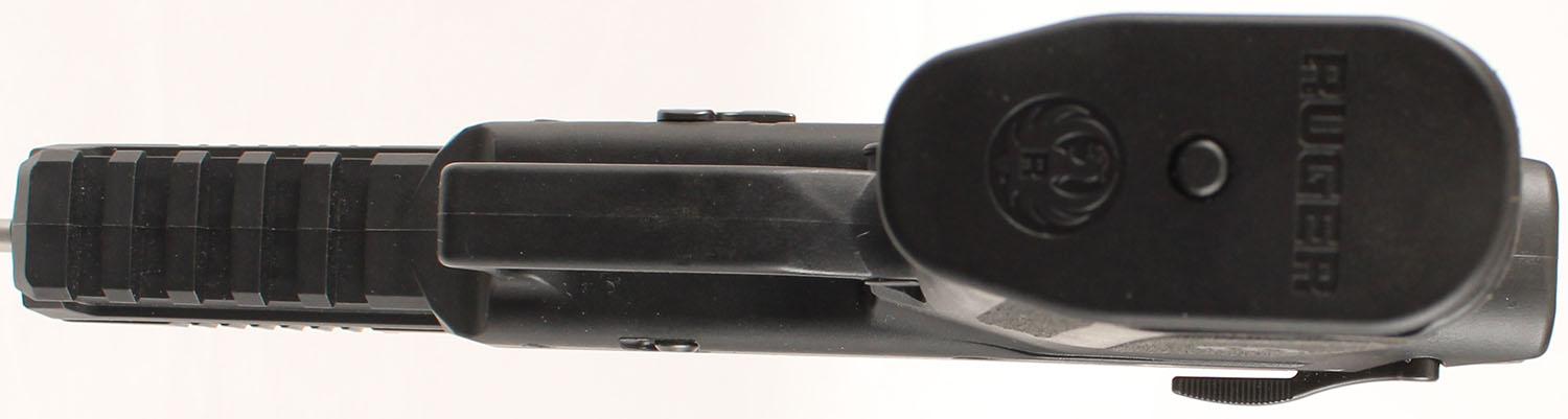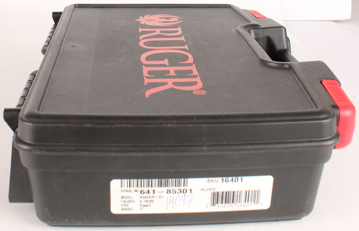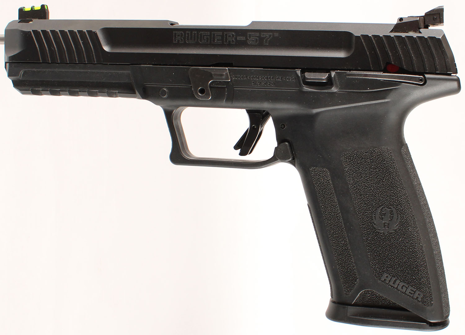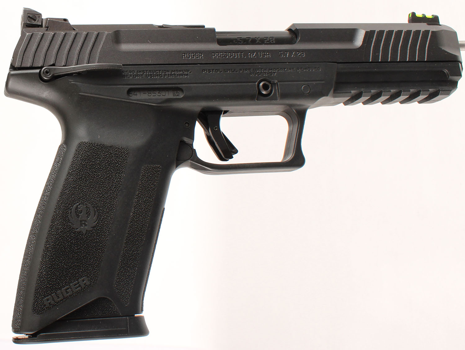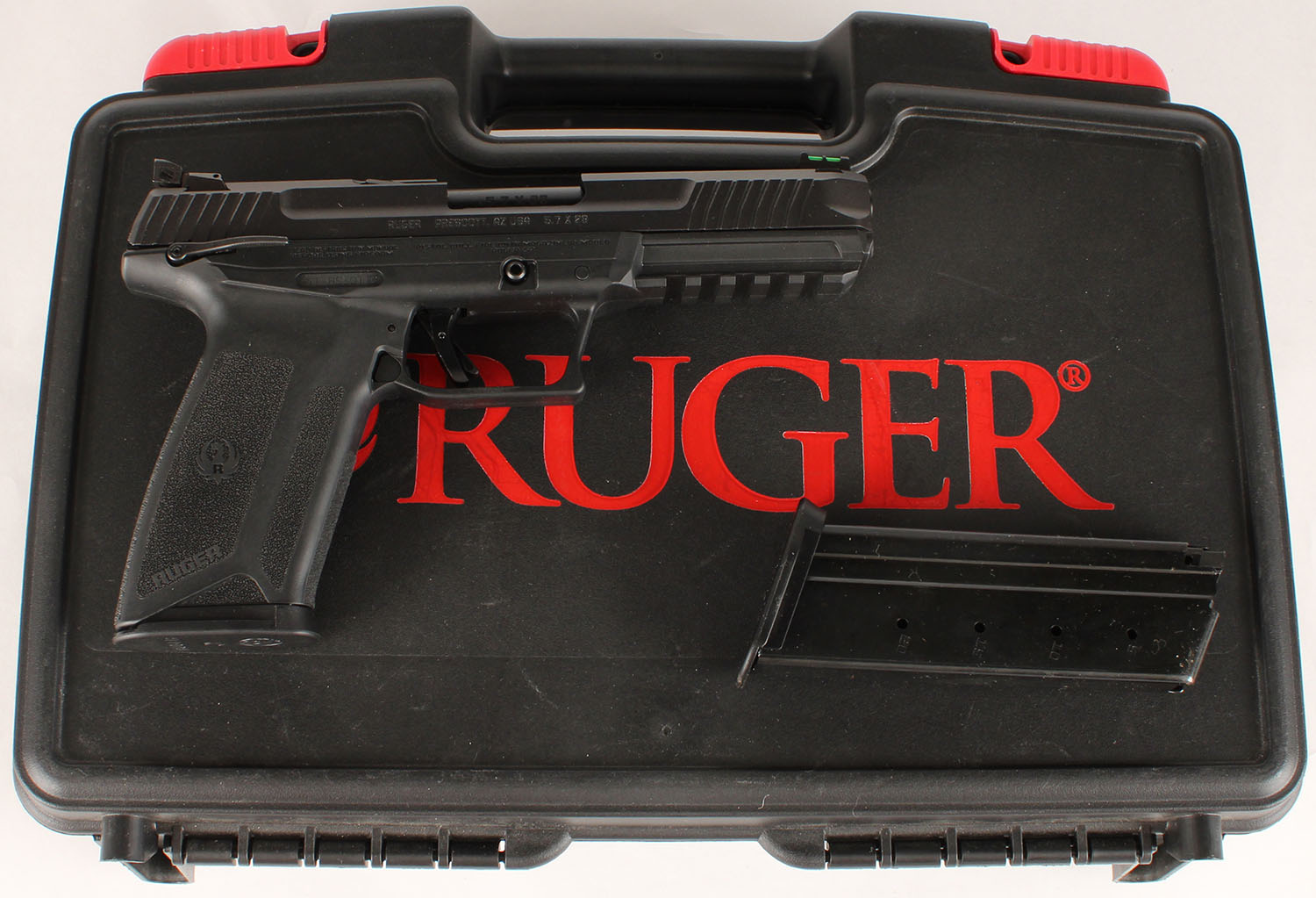 CASED, Ruger-57, CAL: 5.7x28, MFG: Modern, SN: 641-85301, Semi Auto Pistol, 5'' barrel. The Ruger textured polymer grip frame is excellent. The factory black Nitride finish rates 99%+ overall. Bore is excellent. Factory adjustable rear sight & green fiber optic rail front sight. Comes in factory hard case, with related paperwork, extra magazine & lock. FFL Req. - Value: 500 to 800