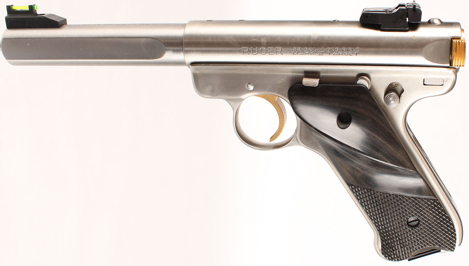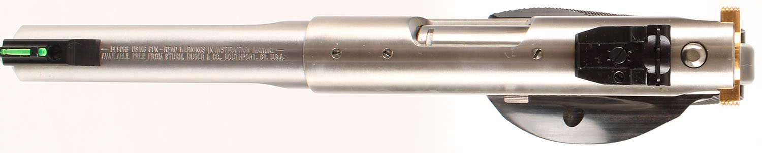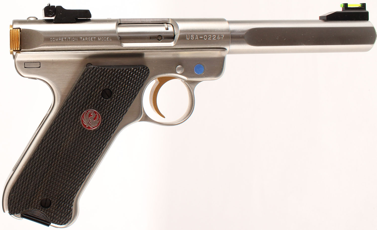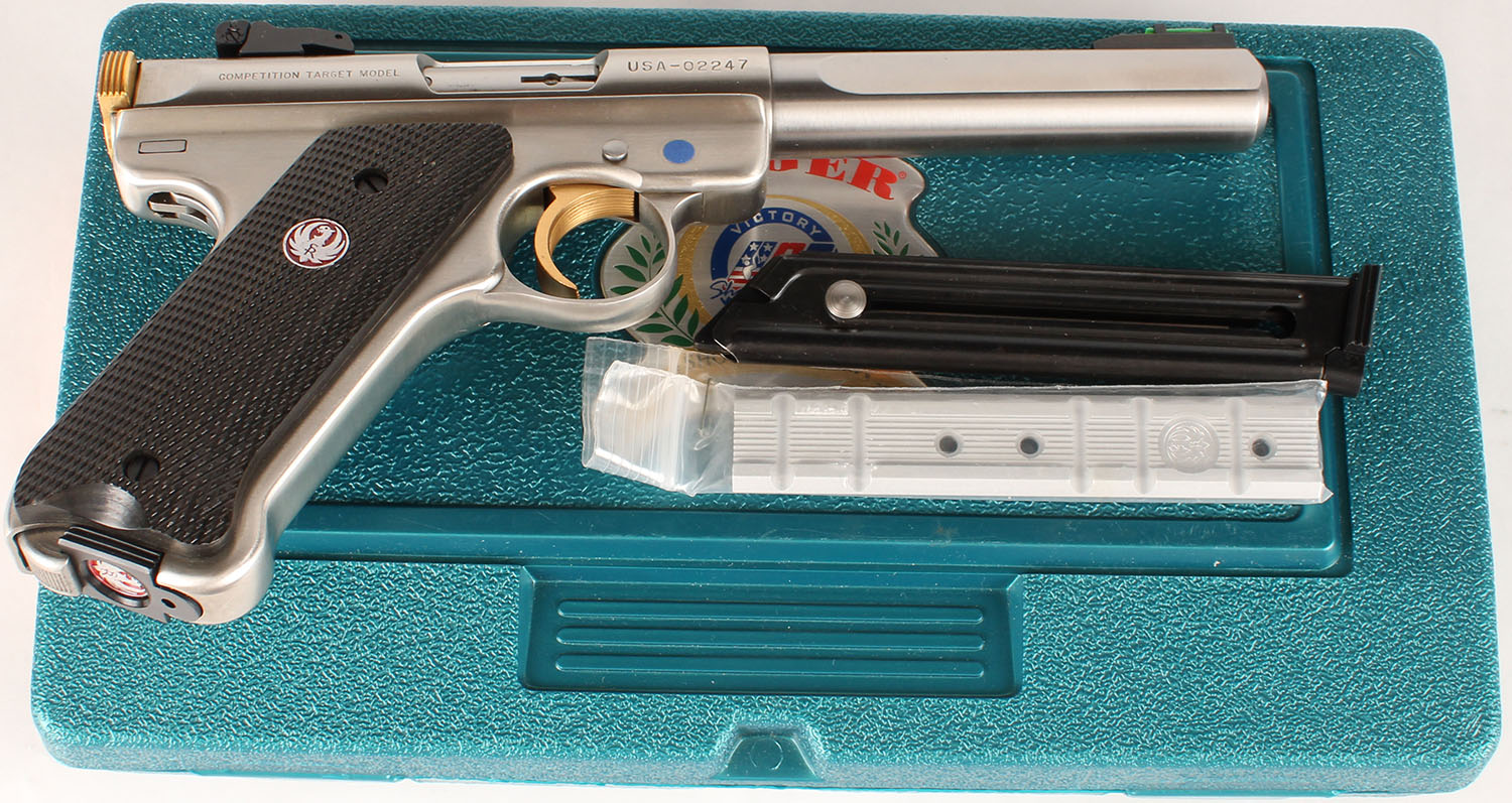 CASED, Ruger, Mark II Target Competition Target Model, CAL: 22LR, MFG: 2004, SN: USA-02247, Semi Auto Pistol, 5 1/2'' barrel. The Ruger logo medallion checkered target grips are mint. The stainless steel finish is excellent. The gold tone trigger & bolt are excellent. The rear face of the bolt marked ''USA Shooting Team'' surrounded by ''Victory in Athens'' Bore is excellent. Fully adjustable rear sight & elevated green fiber optic rail front sight. Comes in factory blue hard case, with related paperwork, extra mag, scope rail & interchangeable fiber optic rails w/tool. FFL Req. - Value: 400 to 800