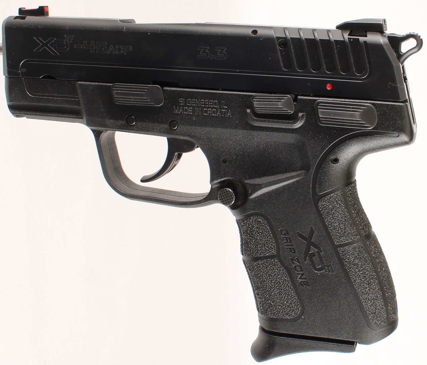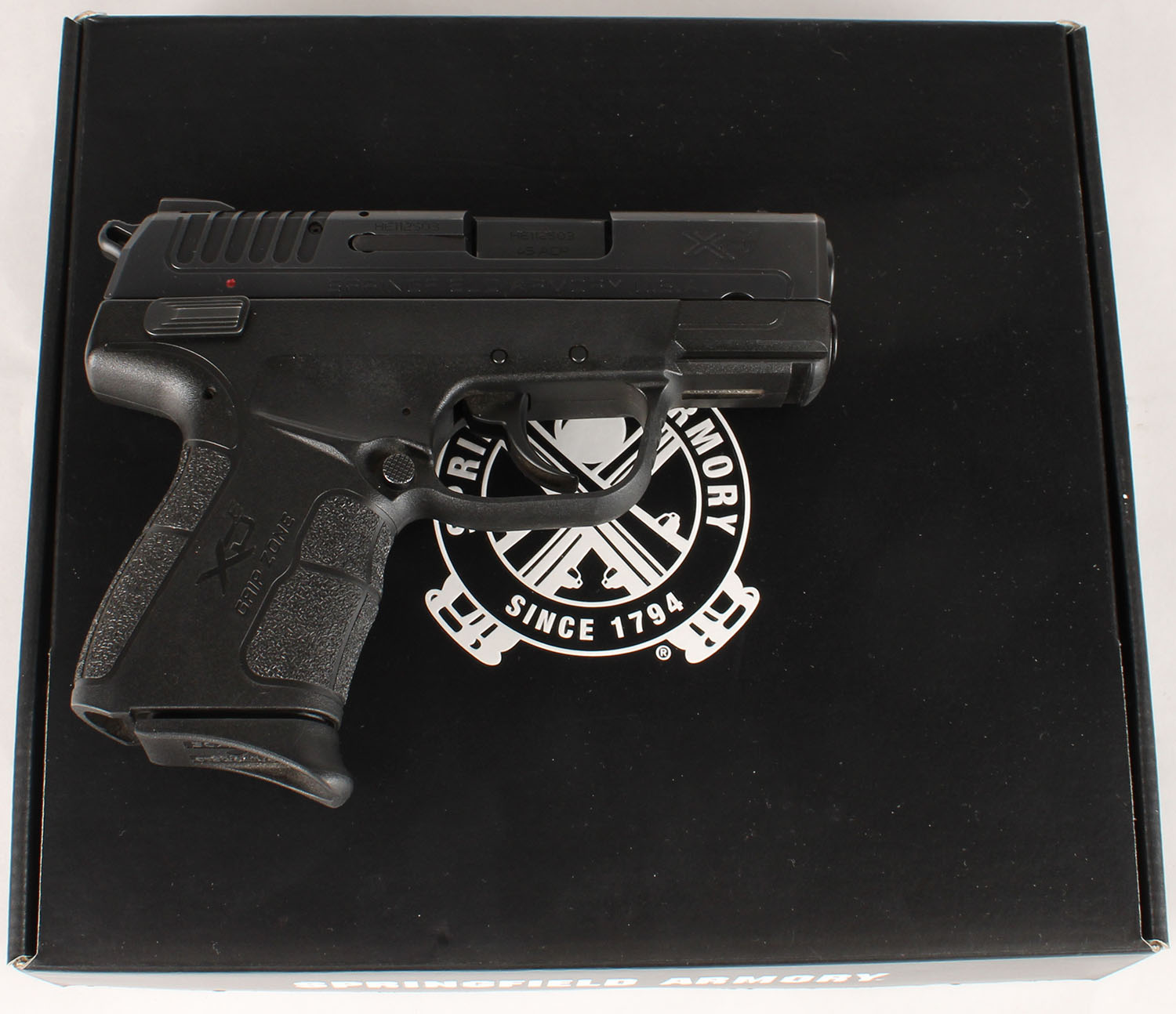 BOXED, Springfield Armory, XDE, CAL: 45, MFG: Modern, SN: HE112503, Semi Auto Pistol, 3 1/8'' barrel. The textured polymer grip frame with ''Grip Zone'' is excellent. The Melonite finish on the slide rates 99%+. Bore is excellent. Factory rear contrast sight & red fiber optic rail front sight. Comes in SA factory box, with SA soft carrying case, lock/key. FFL Req. - Value: 300 to 500