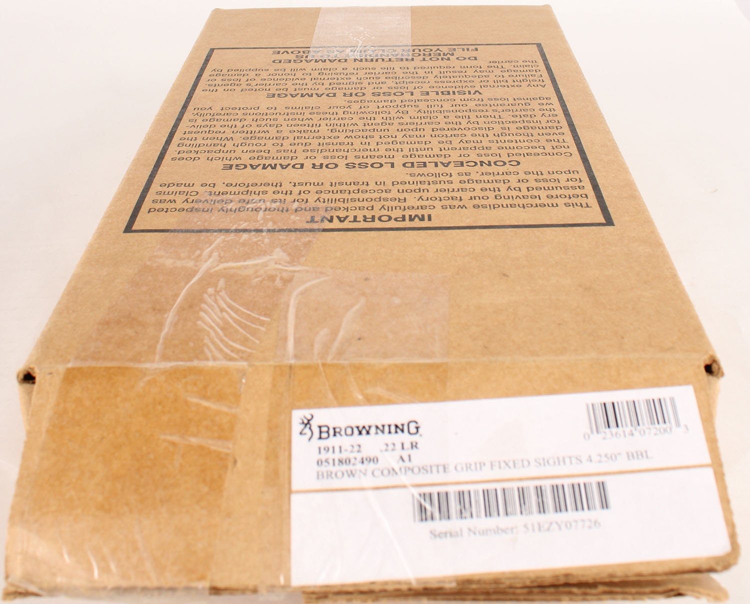 BOXED, Browning, 1911-22 A1, 1911-2011 100 years Edition, CAL: 22LR, MFG: Modern (2011), SN: 51EZY07726, Semi Auto Pistol, 4 1/4'' barrel. The checkered plastic grips are excellent. The factory matte finish on the frame & slide rates 99%+ overall. Bore is excellent. Factory fixed sights. Comes in Browning 100 Years cloth case with leather accents & outer cardboard sleeve. Included is related paperwork, test fire cartridge & lock. In honor of the 100th anniversary of a great firearm, Browning came out with a scaled-down version in .22 Long Rifle, the 1911-22 A1. NOS. FFL Req. - Value: 400 to 600