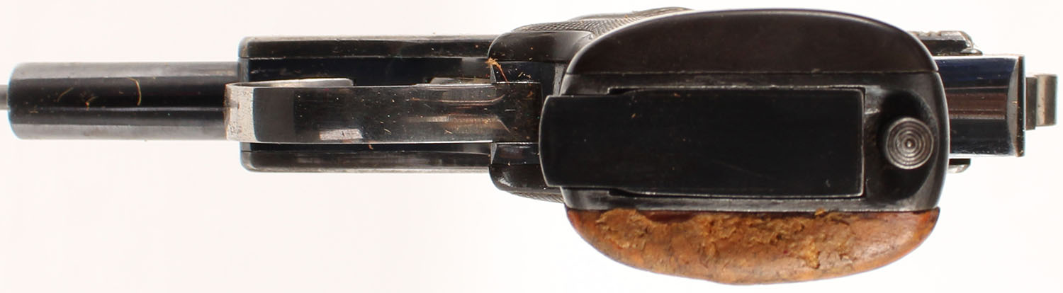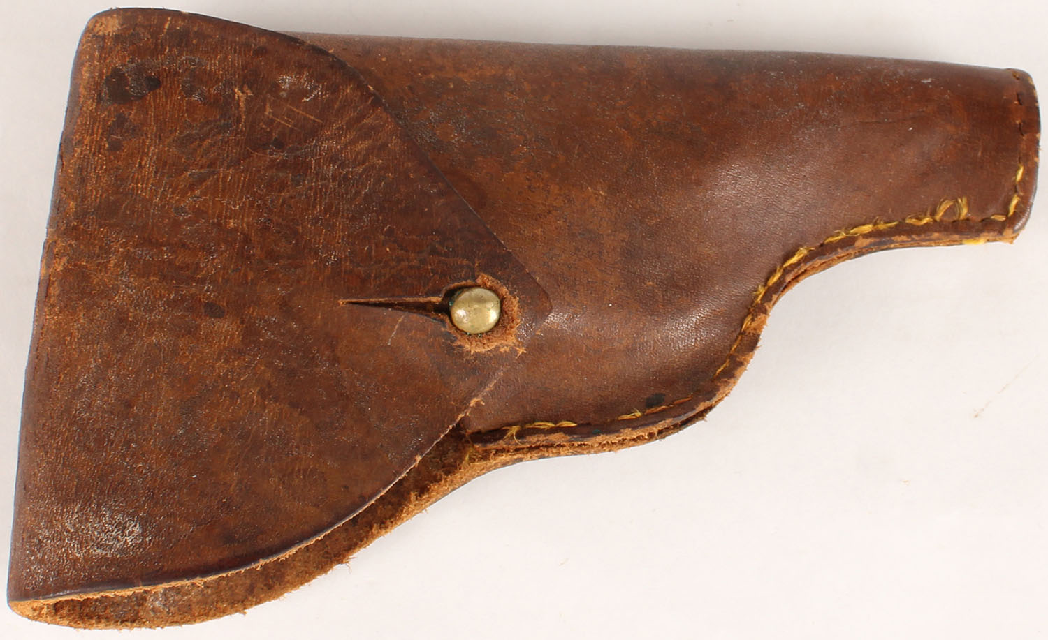 Webley & Scott, Model 1908 Standard Model, CAL: 7.65 (.32 Auto), MFG: 1910-32, SN: 56418, Semi Auto Pistol, 3 1/2'' barrel. The checkered plastic grips are fair. The right grip has a large chip & the areas has been replaced by a piece of wood, with filler to bind it to the other grip. The right grip has light overall wear. The metal blue finish rates 60% overall, with areas worn to metal grey. Bore is fair, with consistent roughness & pitting. Groove & blade sights. Comes with an unmarked leather holster. Holster is fair, with the main seam split at the threads. FFL or C&R Req. - Value: 100 to 300