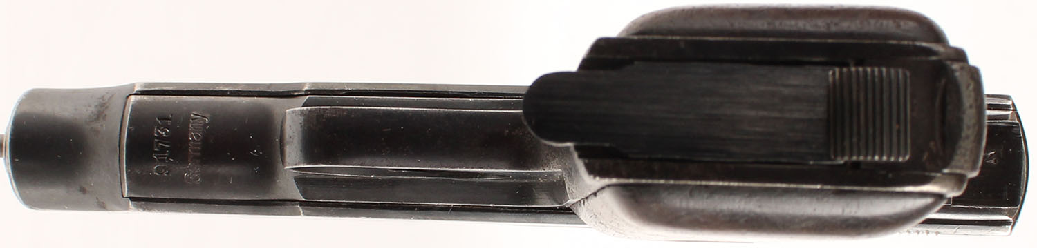 Deutsche Werke, Ortgies Patent, CAL: 7.65 (32 Auto), MFG: 1919-24, SN: 91731, Semi-Auto Pistol, 3 3/8'' barrel. The left side of the slide is marked ''DEUTSCHE-WERKE (LOGO) WERK EFURT'', the right side is marked ''ORTGIE'S PATENT'' & the frame, on the underside of the barrel is marked with the full SN, over ''GERMANY''. The logo brass medallion wood grips are excellent & solid, with scrapes & dings to the finish. The metal blue finish rates 75% overall, with a thin brown patina, areas of pitting & the muzzle has worn to metal gray. Bore is very good, with strong rifling & consistent roughness. The slide holds a fixed small notch rear sight & small blade front sight. FFL or C&R Req. - Value: 100 to 250