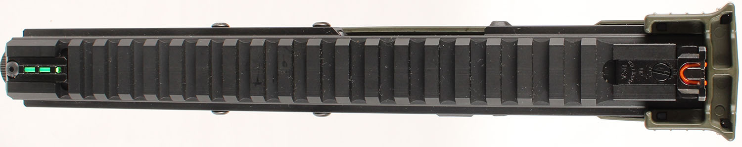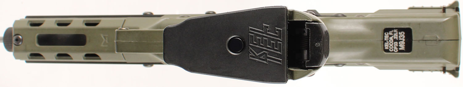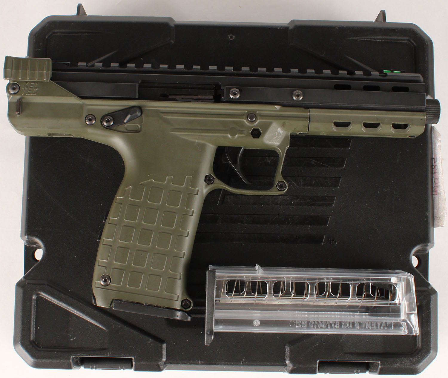 CASED, Kel-Tec, CP33, CAL: 22LR, MFG: Modern, SN: M9J35, Semi Auto Pistol, 5 5/8'' barrel. The green synthetic grip frame is excellent. There are storage & handling marks. The matte black finish on the barrel/receiver housing rates 99%. Bore is excellent. Williams red fiber optic two-dot rear sight & green fiber optic rail front sight. Factory integrated full length picatinny rail and a MAGPUL ?M-LOK slot built into the dust cover for optics & accessories. Comes in factory hard case, with related paperwork, trigger guard lock & extra magazine. Holding a whopping 33 rounds in the magazine, each CP33 magazine holds (4) rows of .22LR. FFL Req. - Value: 400 to 500