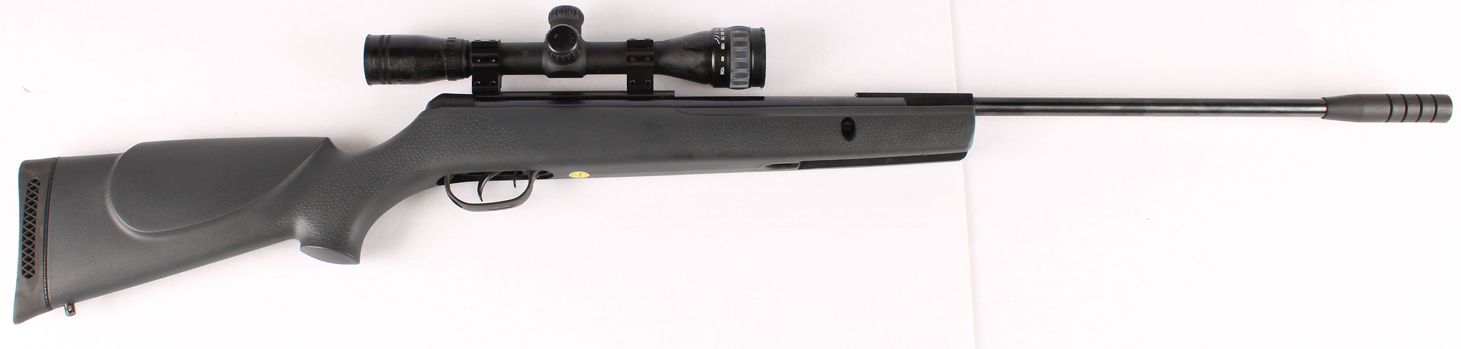 GAMO, NRA 1000 Special, CAL: 4.5 (.177), MFG: N/A, SN: NRA-006774, Break Action Pellet Gun, 18 1/2'' barrel. The gray synthetic textured & cheeked pistol grip Monte Carlo stock is excellent. There is a NRA commemorative crest on the left side of the stock. The metal finish is excellent. Bore is excellent. Stock has a ventilated recoil pad. The rifle has a NRA 4x32AO scope. Scope has a sticky substance on it. Grade: Excellent - Value: 50 to 150