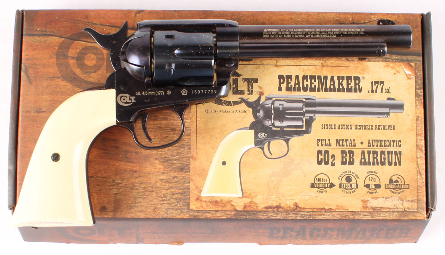 BOXED, Colt SAA Peacemaker, CAL: .177, MFG: N/A, SN: 15D77729, Single Action Revolver BB GUN, 5 1/2'' barrel. This is a full metal authentic Co2 powered BB gun. The faux ivory grips are excellent. The barrel & frame have standard markings with warning label on the right side. The metal blue finish is excellent. Standard sights. Comes in original box with related paperwork. BB Gun, No FFL Req. - Value: 100 to 300
