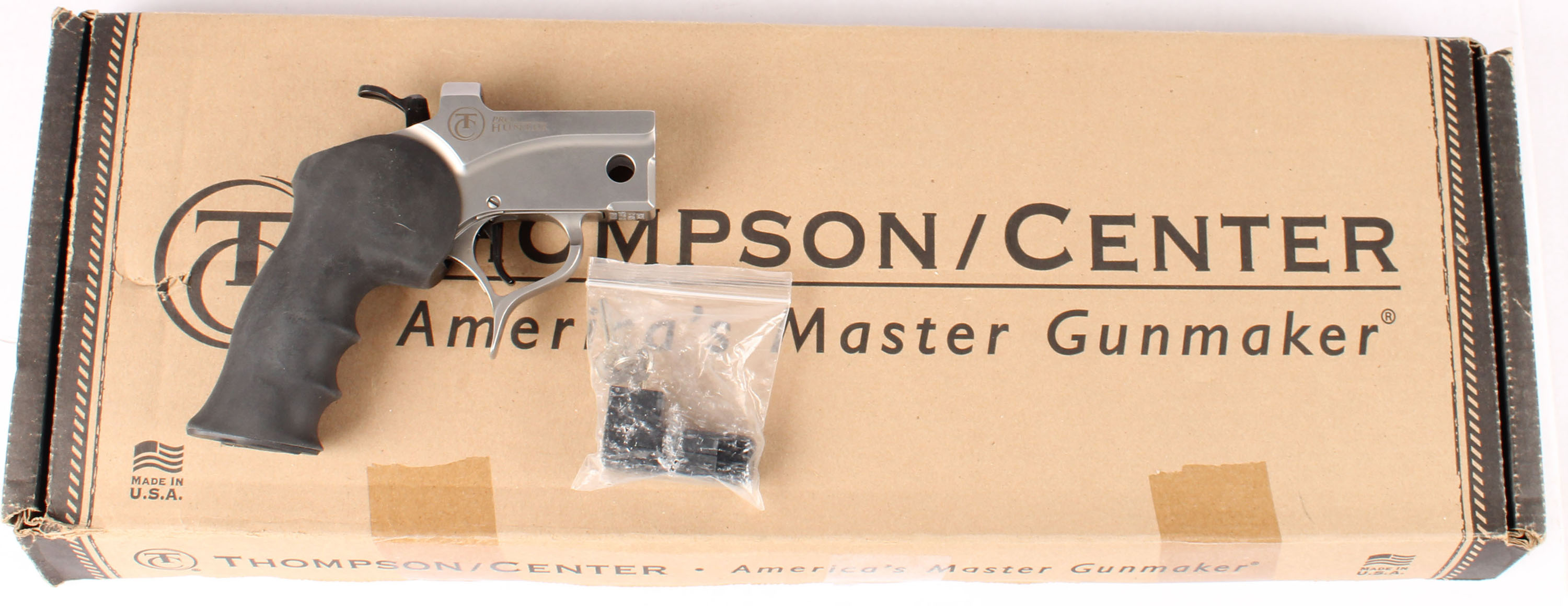 BOXED Thompson Center Encore Pro Hunter pistol frame/receiver (SST/RBR), MFG: Modern, SN: MAL6829. This is the receiver that can be used to add numerous options of calibers, barrel lengths & type of firearm. The factory rubber grips are excellent. The stainless steel frame is likewise excellent. Black finished hammer & trigger. Comes in the original factory box with hammer lock & key. Various barrel options listed in the following auction lots. FFL Req. - Value: 250 to 400