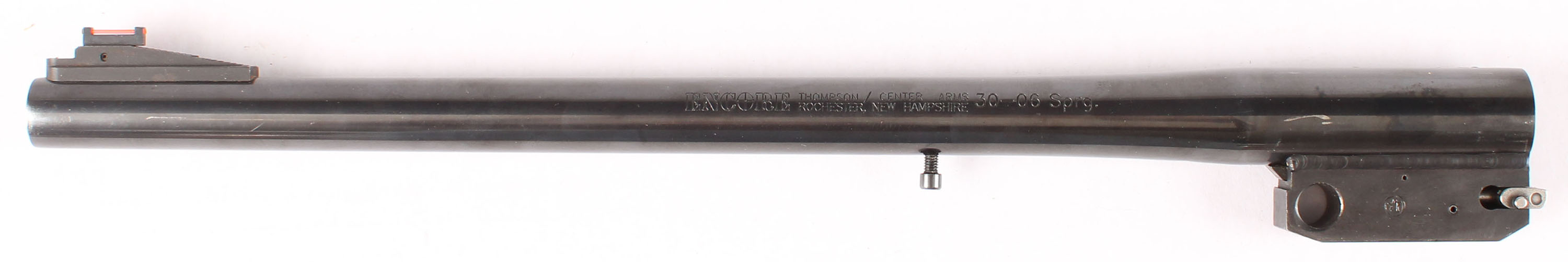 Thompson Center Arms, Encore 30-06 Springfield caliber, 15'' Round blued barrel. No rear sight, ramped fiber optic rail front sight. Excellent blue. Excellent bore. Excellent overall condition. Inventory from closed gun shop. - Value: 100 to 250