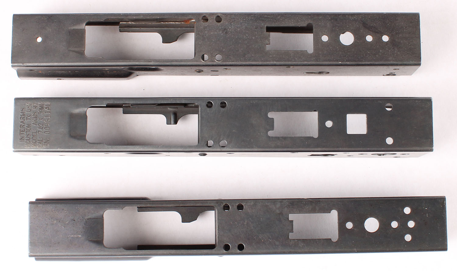 Lot of three AKM Receivers, two Century International Arms (D.C. Industries) Model: M70B2 (AKMS), with the bulge front trunnion, One Interarms, AKMS 47 receiver. All are excellent with minor scratches. Gun PARTS SOLD ''AS-IS, WITH NO RETURNS, FFL Req. - Value: 80 to 160