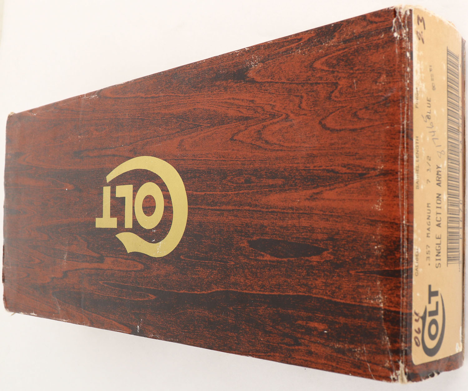 BOX ONLY: Colt Model Single Action Army Revolver, 357 Magnum, 7 1/2'' Blued finish.. Wood grain outer box has original end label. The inner styro case has original instruction manual, the Colt Companion brochure, & NRA card.. Box condition is excellent. - Value: 20 to 100