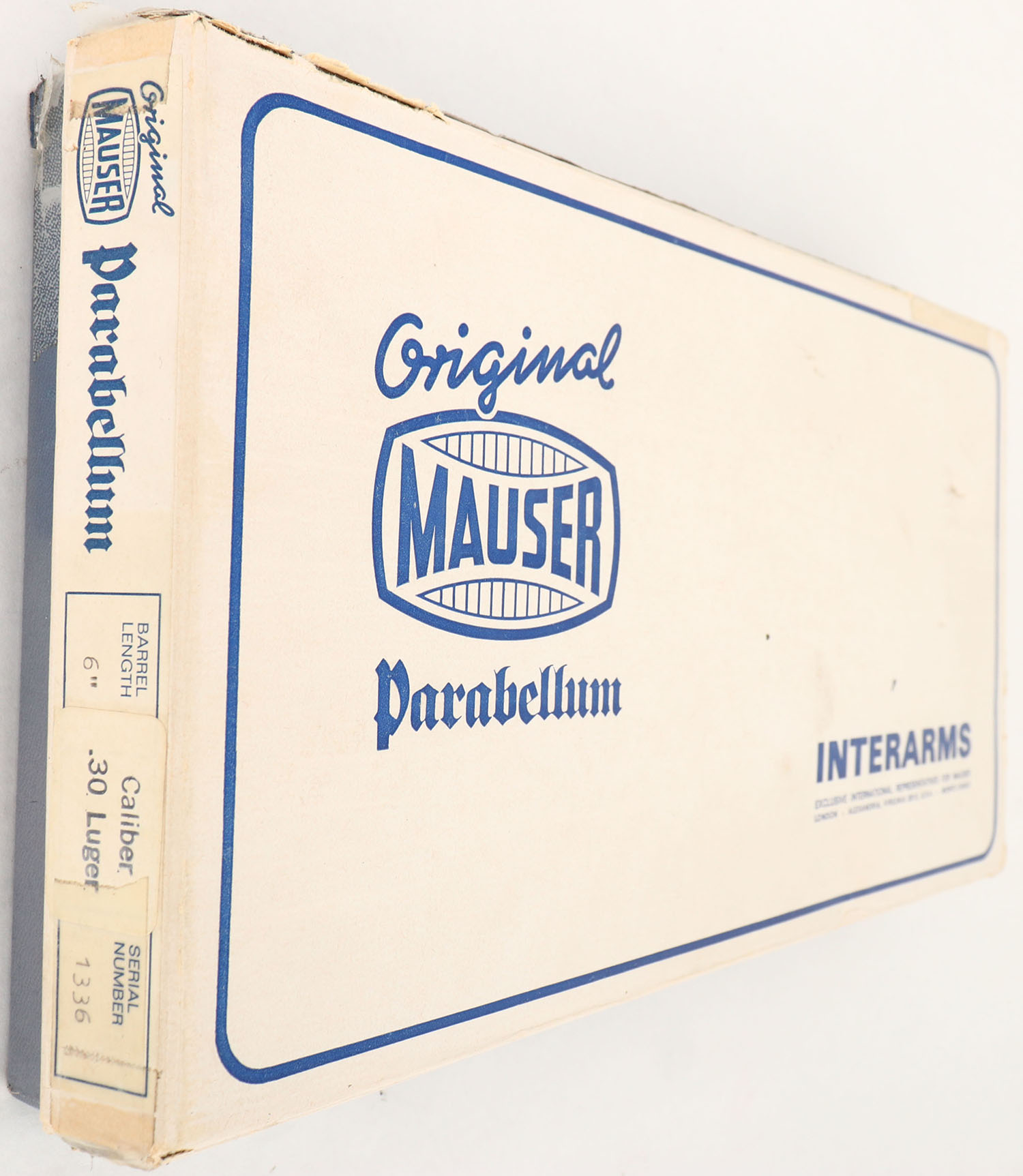 BOX ONLY: Mauser Model The original Mauser Parabellum Interarms two piece box. For 6'', .30 Luger Caliber. Has original end labels. Has the inner styro cutout, with the orginal factory test target. Box condition is very good. - Value: 10 to 100