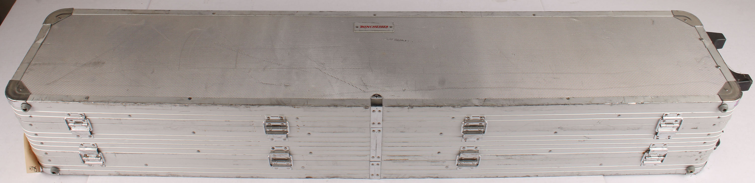 Winchester, aluminum 2 tier gun case, has foam inserts, folding handles, spots for padlocks, & wheels. Case has minor scratches, dings, dents, & scuffs from use. Case is 53'' x 10'' x 8 1/4''. Grade: Very Good ++ - Value: 50 to 150