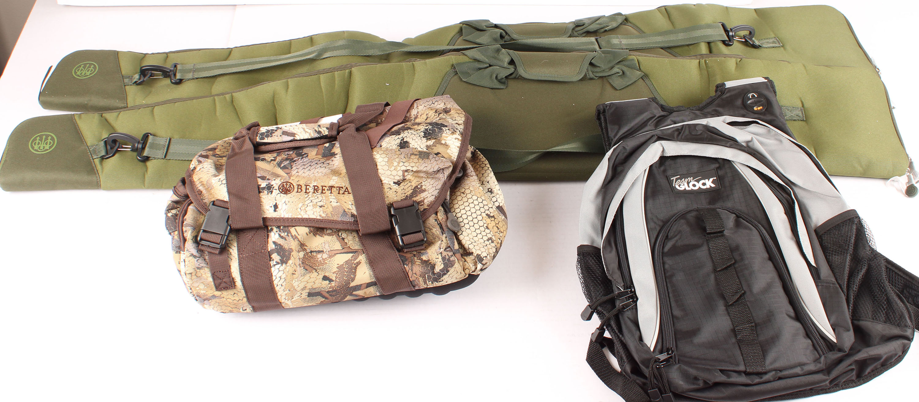 Lot of (2) Beretta soft gun cases, (1) Beretta Bag, (1) Glock Backpack, closed gun store inventory. Grade: MINT - Value: 30 to 120
