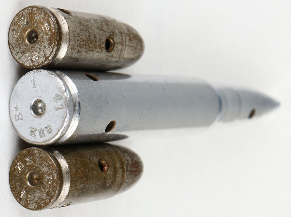 Lot of 3. German military dummy cartridges. (2) 9mm Parabellum: HS: ''P 24 EX'', Tin over brass w/ four holes. (1) 7.9x57mm Werkzeug: HS:''aux S* 1 41''. Chromed case and bullet w/ 4 holes on case and two holes on bullet. Grade: Very Good ++ - Value: 20 to 60