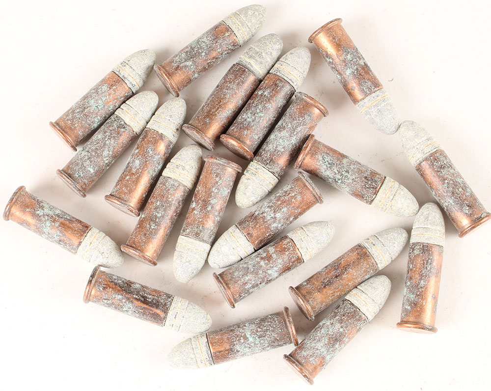 Lot of 20. 32 Long Rimfire. All with Impressed ''U''. Union Metallic Cartridge Co. Copper case and pointed lead bullet with two visible cannelures above the case mouth. Grade: Very Good + - Value: 40 to 80