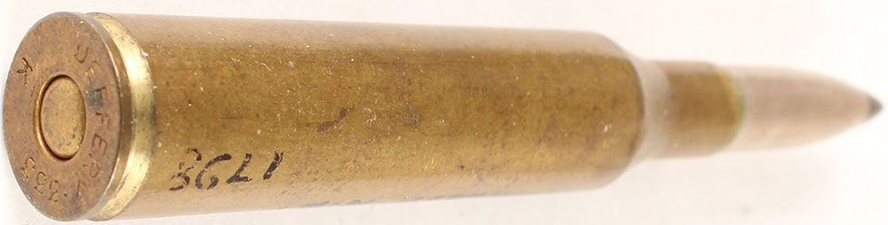 333/280 Jeffery. HS:''JEFFERY 333 K'', PT CN w/ copper tip. Factory loaded using .333 cases. Grade: Excellent - Value: 20 to 50