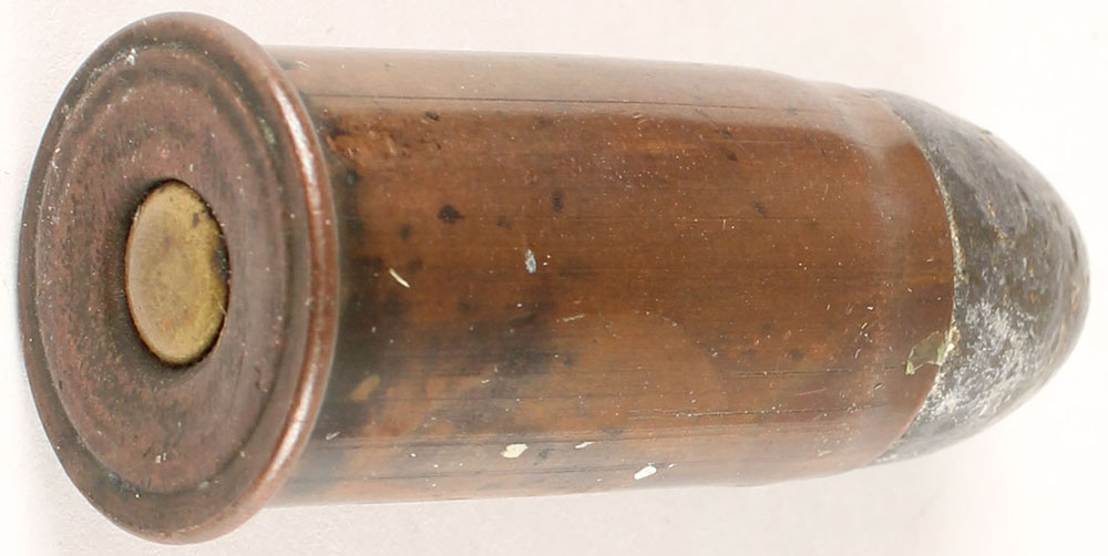 58 Remington Carbine. NHS, RN Lead. Copper Case w/ brass primer. See Hoyem V2, CFR 45. Grade: Very Good + - Value: 20 to 50