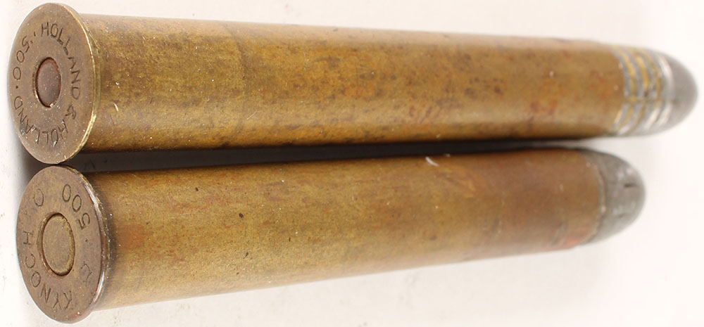 Lot of 2. (1) 500 x 3.25'', HS:''Holland and Holland 500'', RN Lead with copper tube. (1) 500 x 3.00'', HS:''KYNOCH C 500 L' RN Lead with copper tube, Nitro for Black Powder, Plier marks on lead bullet. Grade: Very Good ++ - Value: 20 to 60