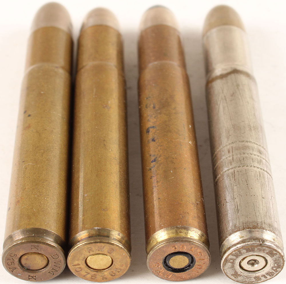 Lot of 4. 10.75x68mm Mauser. (1) HS:''RWS 10.75x68'', RN CN SP. (1) HS:''DWM K 515A K'', CN FN Hollowpoint. (1) HS:''RWS 10.75x68'', RN CN FMJ. (1) HS:''DWM K 515A K'', DUMMY, Tinned case, 3 ratchet cannelures on case, hollow bullet. Grade: Excellent - Value: 20 to 50