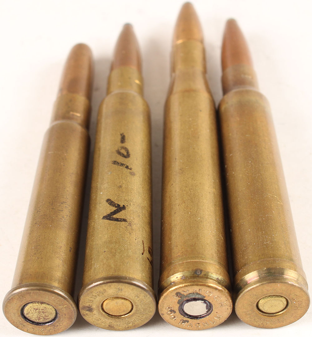Lot of 4. Mixed lot of British medium caliber ammunition. All by Kynoch. One each: .275 H&H Magnum. 275 Holland Flanged, 300 H&H Magnum, 303 British sporting. Grade: Excellent - Value: 10 to 30