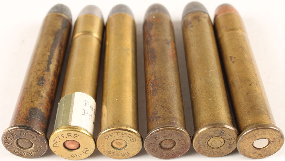 Lot of 6. 45-90 WCF. (3) by Peters--all different, (2) by WRA Co.--same, (1) by Dominion, HS:''D.C.Co 45-90'', FN Lead. Grade: Very Good + - Value: 40 to 80