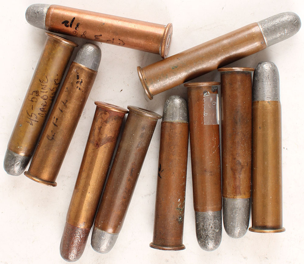 Lot of 10. 45-70 Govt. Copper cases by Frankford Arsenal. 5 bullets at 500 grains and 5 bullets at 405 grains. HS are either C F or R F with various dates. Grade: Very Good ++ - Value: 40 to 80