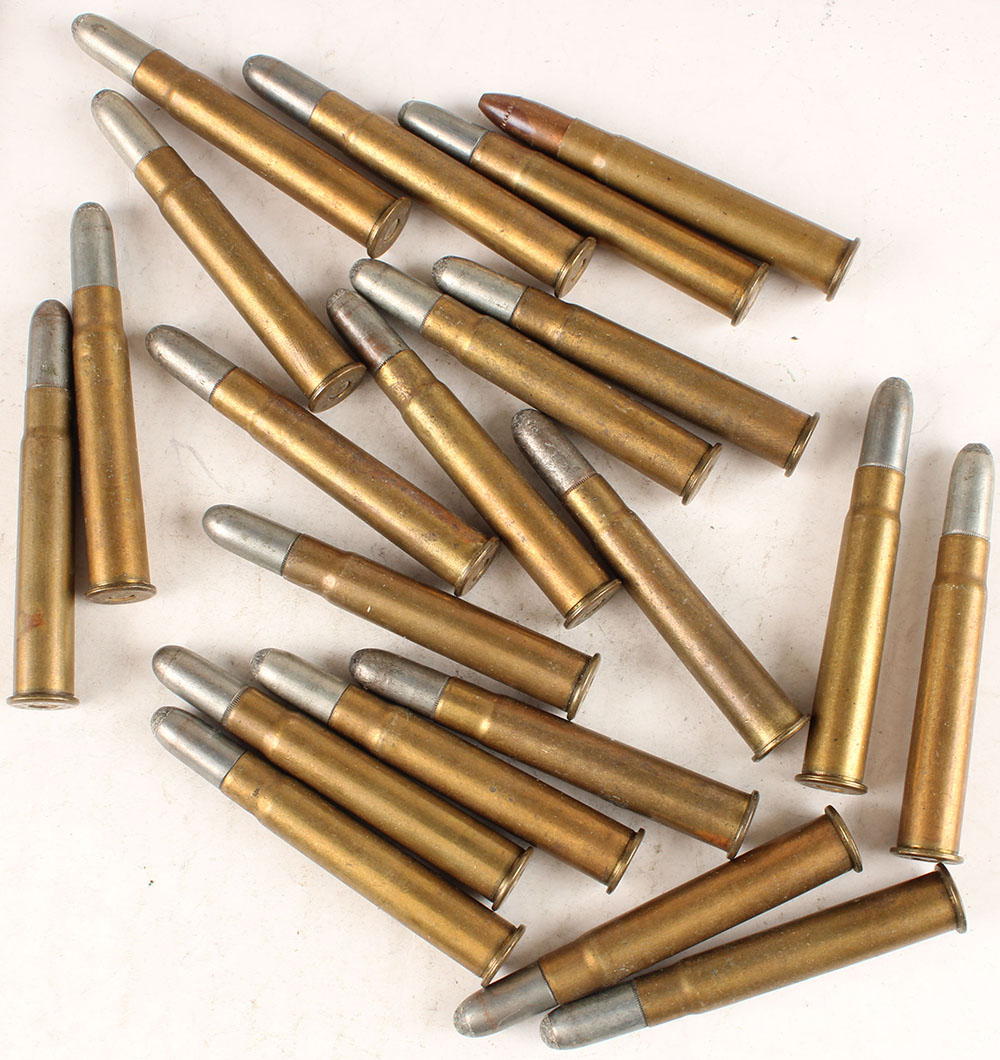 Lot of 21. 35 Winchester. (20) by Winchester, HS:''WRA Co 25 W.C.F.'', (19) RN tinned SP, (1) CJ hollowpoint. (1) by REM-UMC, HS:''REM-UMC 35 CF'', RN tinned SP. Grade: Very Good ++ - Value: 100 to 200
