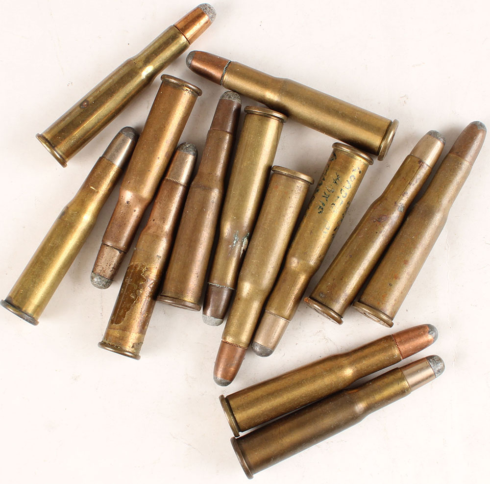 Lot of 13. .303 Savage. Various manufacturers, (1) Kynoch, (6) Peters(including one two hole dummy), (2) REM-UMC, (1) Winchester, (3) Savage Arms Co. All loaded rounds carry softnose bullets. Grade: Very Good + - Value: 40 to 80