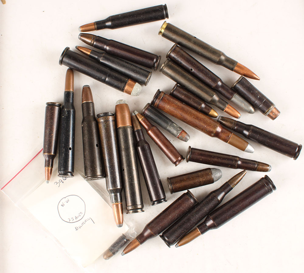 Lot of 25. A collection of blackened Winchester dummies in several different styles in the following calibers: (2) 257 Roberts. (1 ea) 30 USG, 6mm Rem, 300 Win Mag, 30-30 Win, 338 Win Mag, 264 Win Mag, 348 Win, 243 Win, 22-250, 356 Win, 30-06, 458 Win Mag, 25-06, 225 Win, 307 Win, 270 Win, 256 Win Mag, 222 Rem, 32-20, 44 Mag, 25 Auto, 45 Colt, 45-70 Govt. Grade: Excellent - Value: 40 to 80