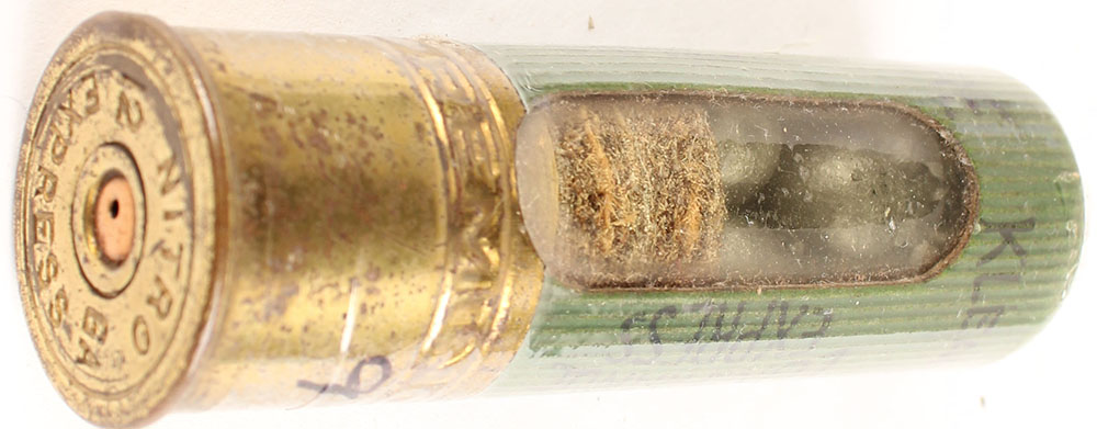 H/S= ''NITRO Express 12ga'' 2 1/2'' OAL, window shell, salesman sample in green paper case. Grade: Excellent - Value: 6 to 50