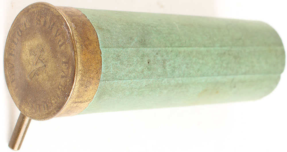 H/S= ''Fabrique Gevelot Paris 4ga'' 3 1/16'' OAL, empty pinfire, green paper case. Grade: Very Good + - Value: 10 to 80